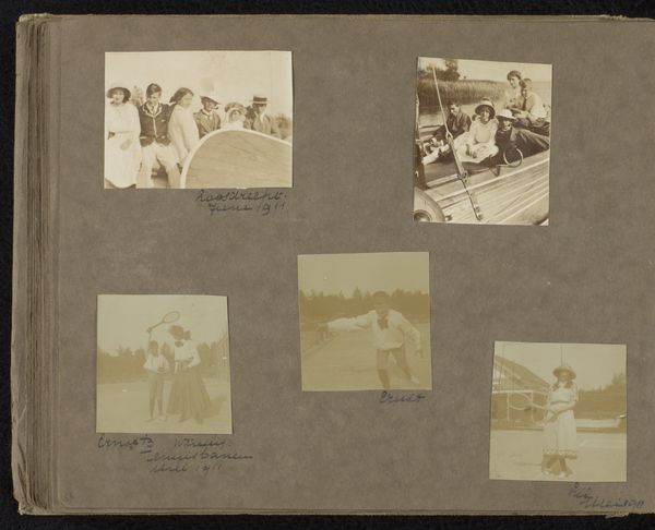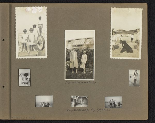 Editor: This gelatin-silver print, dated 1930, is titled "Loentje Furnée met vrienden en kinderen op het strand van Noordwijk, met Piet van Ostrop, Jeanne Kessler en Kay Liefter." It feels like a casual family album, a snapshot of a day at the beach, and its being part of a larger album is important I think. What strikes you about it? Curator: I am particularly drawn to the material reality of this work. It's not just a photograph, but a gelatin silver print. Think about what that means in terms of production. Someone had to meticulously coat paper, expose it to light, and develop it in a darkroom. Editor: Right, a whole process! It's easy to forget with digital photography today. Curator: Exactly! And consider the social context. These are not posed studio portraits, but rather glimpses into the leisure activities of, presumably, middle-class families in the interwar period. How does the informality of the composition change the way we perceive it? Editor: It definitely makes it feel more personal and authentic, less staged than something like formal society portraits from that period. Curator: Think about the materials beyond just the photograph itself – the swimsuits, the beach chairs, even the sand. All of these point to a specific moment in time, to changing ideas about leisure and the body. Mass produced goods enabled moments of leisure previously available only to an elite to trickle down to a broader population, especially here in the Netherlands. Editor: That makes so much sense. It's easy to look past the material culture of these pictures and focus on the people. It’s the tangible elements surrounding the subjects that situate the work within its era, isn't it? Curator: Precisely! By examining the materials and the means of production, we gain a deeper understanding of the society that produced this photograph. Editor: Thanks, I learned how we can view even seemingly simple snapshots as complex historical objects just by examining them through their material components! Curator: My pleasure! This perspective really highlights the significance of process, labor and social consumption for how we understand an artwork.