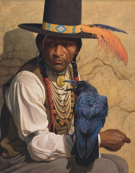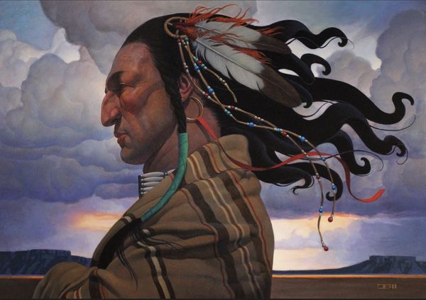Curator: Immediately, there's such a striking contrast. The feathered headdress ablaze with light against a twilight sky. The textures, especially in the feathers and aged skin, create a powerful, almost photorealistic image. Editor: That’s quite apt. The image before us is "Enlightened," by Thomas Blackshear. Predominantly painted with oil paint, it blends elements of realism and romanticism, filtered through a surrealist lens. It portrays an indigenous man, adorned with traditional headdress, set against a nocturnal backdrop. Curator: Romanticism, definitely! There is a certain reverence towards the figure, heightened by the soft lighting. I wonder how much Blackshear engaged with Native American cultures during the creation. This feels less like a portrait, and more like a veneration. Editor: The piece raises crucial questions about representation and power dynamics inherent in such depictions. It reminds me of discussions surrounding identity and authenticity—especially when viewed through the lens of art history’s historical biases. Blackshear's decision to title it "Enlightened," places emphasis, or perhaps an implied value, on what could be construed as "wisdom" or even exoticism attributed to the portrayed figure. Curator: A good point. However, within the wider historical and cultural contexts, the choice might serve another purpose too. One wonders if the painting means to challenge and destabilize some cultural assumptions? Was the title's intent ironic or celebratory, and to what end? Editor: Irony might provide space for challenging established norms. How do we, as contemporary viewers, navigate the image with the consciousness of cultural appropriation, authenticity, and the historical burden carried by indigenous communities? The interplay of light and shadow certainly guides our attention, but does it encourage true understanding or perpetuate romanticized ideas? Curator: Such complexity! It encourages us to question not only the painting's context, but also our own interpretations of its meanings through our socio-cultural experience. Perhaps it's this interrogation that gives the artwork its staying power. Editor: Ultimately, “Enlightened” reveals art’s ability to reflect the evolving dialogue surrounding culture, history and identity, and invites viewers to examine their own preconceived notions about it all.