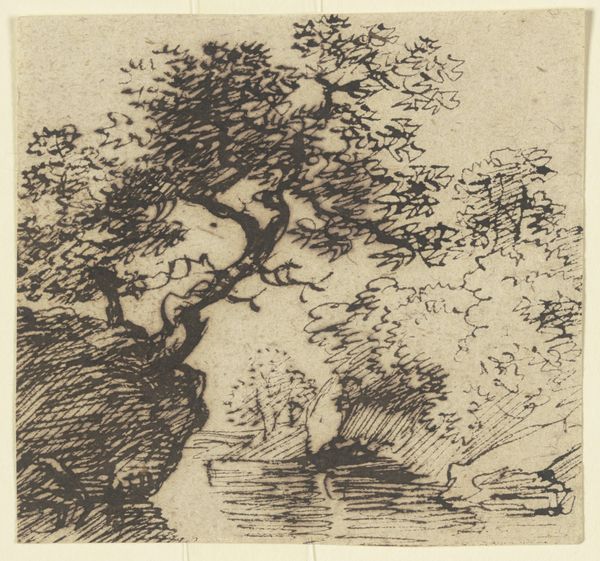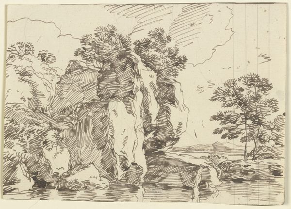 Curator: Here at the Städel Museum, we have "Zerklüftete Felspartie an einem Gewässer," which translates to "Craggy Rocks at a Body of Water," rendered in ink on paper. It's attributed to Franz Kobell, dating back to the late 18th century. The landscape tradition certainly pulses through this piece. What catches your eye, first and foremost? Editor: The way the light plays across those rocks. There’s something quite stark about the image. The bare branches against the sky suggest a specific time of year, perhaps hinting at themes of death and rebirth so common during the Romantic era? Curator: Yes, that somber tonality is rather evocative, isn’t it? Remember, in the late 1700s, landscape painting was about more than pretty scenery. It became a vehicle to explore powerful ideas of nature's grandeur, its capacity for both beauty and destruction, very much fueled by Enlightenment and Romantic philosophies. The etching style lends itself perfectly to capture this range. Editor: Precisely. Consider the Romantic obsession with the sublime. Those craggy rocks and gnarled trees aren’t just topographical features, they evoke a psychological state. The image conveys isolation, even a kind of spiritual contemplation. Are we perhaps meant to feel the insignificance of the human presence, set against nature’s ageless power? Curator: That interpretation rings true when considering the social role of landscape in those times. Think of the emerging middle classes venturing into newly accessible landscapes. These images visually articulated anxieties about our place in an industrializing world while simultaneously celebrating national identity, of which landscape was becoming emblematic. Editor: Indeed, one sees here a possible encoding of this very tension. But in the immediate, the image strikes one with the symbolic weight those trees, clouds, and stones carry within our collective psyche. Curator: Absolutely, viewing it now through both lenses allows us to reflect not only upon the visual language of its era but how these pictorial forms may reflect our present preoccupations as well. Editor: A landscape fraught with complex symbolism! A fascinating peek into the meeting of internal emotional terrain with our changing social geography, if I may add.