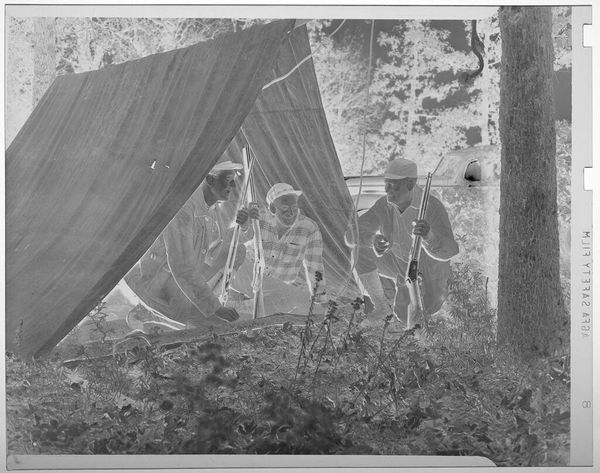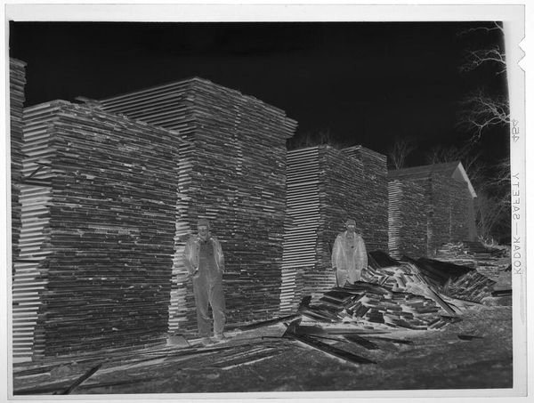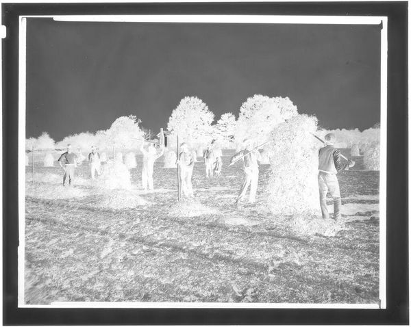 Editor: This photo, "Untitled (farm machinery in field)" by Hamblin Studio, shows a group of people working with machinery in a field. The high contrast gives it a stark, almost ghostly quality. What strikes you about this image? Curator: It speaks to the often-unseen labor that sustains us. Consider the historical context: Who had access to land and machinery, and whose labor was exploited? This image prompts questions about power, class, and the unequal distribution of resources in agricultural landscapes. Editor: So, it's not just a picture of farming, but a commentary on social structures? Curator: Precisely. And notice the absence of detail. It almost erases the individual, highlighting instead the systemic nature of agricultural work and its historical baggage. This piece encourages us to critically examine the narratives we tell ourselves about progress and prosperity. Editor: That gives me a lot to think about. Thanks! Curator: My pleasure. It’s important to remember that art is not created in a vacuum and can be a tool to question established norms and values.