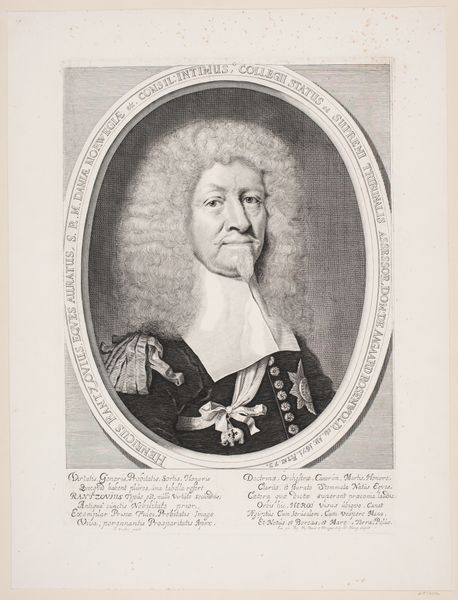 Editor: This is James McArdell’s 1747 engraving, "Portret van Thomas Secker," housed at the Rijksmuseum. The textures created using line are incredibly striking, especially within the ornamental border and Secker’s wig. How do you interpret this work's visual language? Curator: This engraving presents Secker, then the Lord Bishop of Oxford, within a frame brimming with Baroque flourishes. Beyond the purely aesthetic, this framing acts as a symbolic container, separating and elevating the subject. Notice how the lines used to depict Secker's face are softer, more suggestive of human presence. What memories or ideals do you think the artist and patron were trying to invoke here? Editor: I suppose they intended to represent him as both a figure of authority and a gentle presence, someone respectable, but also approachable. Curator: Precisely! Consider the gaze; it's direct, yet not confrontational. The artist uses familiar visual cues, a well-established iconography for portraying authority. The dark robes symbolize ecclesiastical power, yes, but they also contrast with the lightness of his wig and face, signifying knowledge and, perhaps, spiritual enlightenment. The Bishop's gaze holds cultural meaning and perhaps also conveys social expectations from leaders. What do you make of the coat-of-arms featured below? Editor: I missed that at first. It adds to the sense of established power. It makes me consider his lineage and status, adding another layer to the portrait’s symbolism. Curator: Exactly. These emblems are carefully chosen to transmit a complex message of heritage, authority, and social standing. A visual shorthand for a life devoted to the church. We, today, are the recipients of those embedded ideals! Editor: Thinking about it as a collection of symbols really opens up new interpretations for me. It’s much more than just a likeness. Curator: Indeed, these enduring images are more than meets the eye; it is culture made visible.