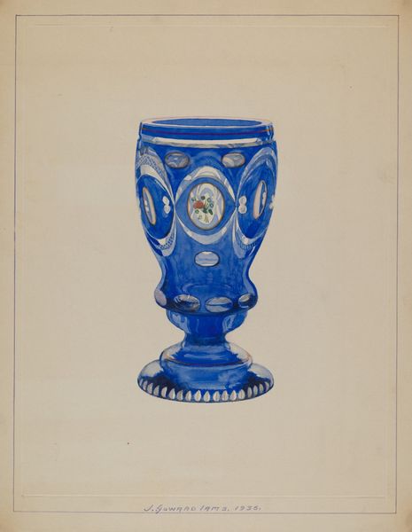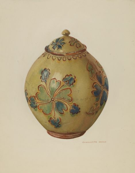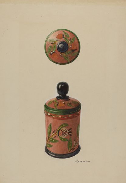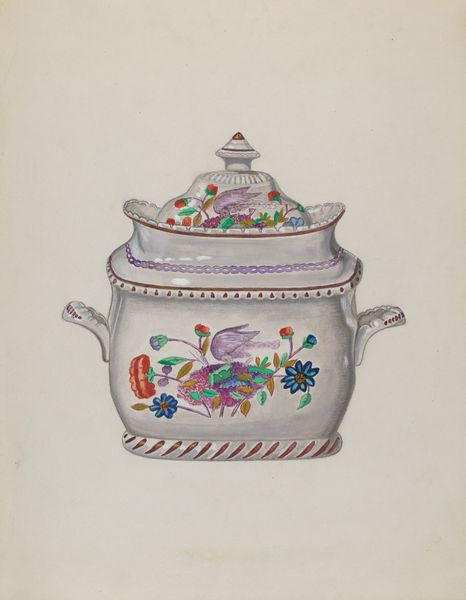 Editor: This is Elmer Kottcamp’s "Sugar Bowl," created around 1938, rendered with watercolor and colored pencil, and seemingly depicting a ceramic object. The composition, showing the bowl and its lid separately, almost feels like a technical drawing. What do you see when you look at it? Curator: I see more than just a sugar bowl. I see the artist engaging with the prevalent styles of the time. Consider the influence of industrial design principles even on something seemingly domestic. What was the intended market, and what materials were being used at this time for mass production of such objects? Editor: So you're focusing on the production context rather than purely the artistic skill? Curator: Exactly. This isn't just about the aesthetic qualities of the piece, it’s about its materiality. Watercolor and colored pencil offer an illusion of ceramic, pointing us toward consumerism. What class of consumers are we looking at and what might have inspired them? Editor: So the choice of medium plays into understanding consumer aspirations of the time? That makes sense. It almost presents this idealized version, removed from the messy realities of the pottery being manufactured. Curator: Precisely! Consider too the labor involved, even in rendering this image. What does that tell us about artistic production versus industrial processes? It highlights the hand, while simultaneously pointing to the machine. What would it mean if they had an original Sugar Bowl instead of its imitation? Editor: I'm starting to see how examining the materials and intended function pushes beyond just appreciating the artwork's visual appeal. Thank you. Curator: And I'm glad that this pushes beyond the aesthetics. Looking at the material and construction makes the viewer dive deeper in history.