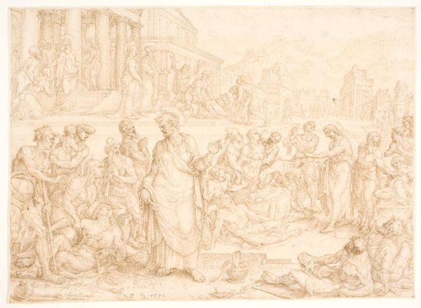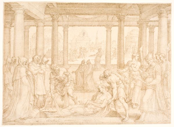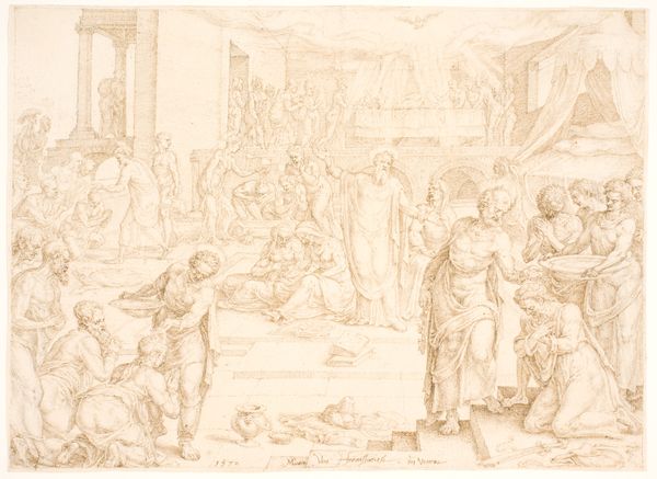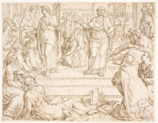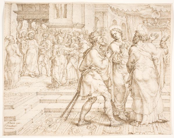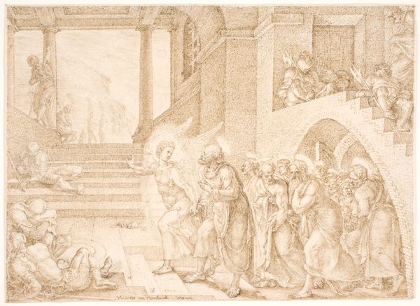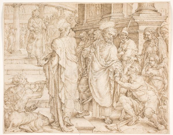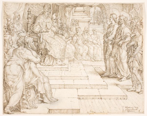 Curator: This drawing, or rather engraving, is titled "St. Peter and St. John are taken Prisoners by the Priests and Sadducees." Created in 1556 by Maarten van Heemskerck, it’s currently housed in the Statens Museum for Kunst. Editor: The mood is instantly tense. I am drawn to the contrast in the robes. Look at the robes on the left. See how rich and ornate they are and then compare those materials with the humble cloths of those who seek refuge on the right side of the work. Curator: Yes, and observe the organization of space here. Heemskerck masterfully employs line work, a technique that’s quite striking given the scene's complexity. Note how line quality establishes foreground, middle ground, and background, creating both depth and a dynamic narrative flow. The composition seems strategically constructed, doesn't it? Editor: Absolutely, and beyond composition, what interests me is the material story—the human story. Look at the textures the artist creates in these lines: you have heavy fabrics, bare skin. They show such a difference in the subjects' access to resources. This all tells a potent tale about power dynamics within a community and speaks of what it means to control the production, control, and ownership of things. Curator: An interesting consideration. I am stuck by the historical context in how it interacts with linear elements to shape meaning and symbolism, for instance, those vertical lines forming the architecture imbue a sense of authority. And the horizontal lines defining the floor and the steps—those emphasize the precariousness of Peter and John's situation. The linear language crafts the meaning of subjugation. Editor: The artist used specific methods—engraving techniques in this instance to portray the disparity in society. I think about who would have had access to prints like this one at the time. It's an intriguing element, because, in that period, art objects reflected complex issues about artistic license versus cultural responsibility. And so the materials speak about power. Curator: I am more engaged in contemplating its design: Its precise organization of linear patterns yields narrative meaning. It’s all so well structured. Editor: For me, that linear precision also documents the material disparity, which speaks volumes about what it was like to live at that time.