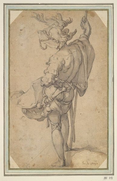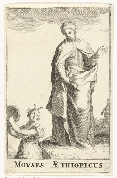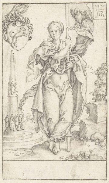 This engraving, "Waakzaamheid of Zorgvuldigheid," or Vigilance by Heinrich Aldegrever, presents us with a study in form and allegorical symbolism. The composition is dominated by the figure of Vigilance, her draped form centered and anchoring the verticality of the piece. Note how the artist contrasts the smooth texture of her skin with the intricate folds of her drapery, achieved through meticulous cross-hatching. She holds a staff, topped with a watchful bird, while a shield adorned with a squirrel sits to her left—symbols of alertness and provision. Aldegrever's use of line is particularly striking. See how he employs varying thicknesses to define shape and create depth, a technique that enhances the tactile quality of the print. The placement of the figure atop crumbling stones suggests a foundation under scrutiny, echoing the theme of vigilance. The work challenges us to consider the balance between observation and action, inviting a deeper contemplation on the structures of moral and societal order.