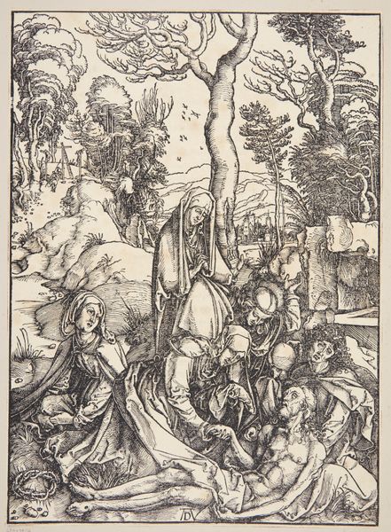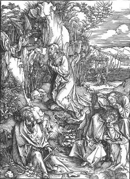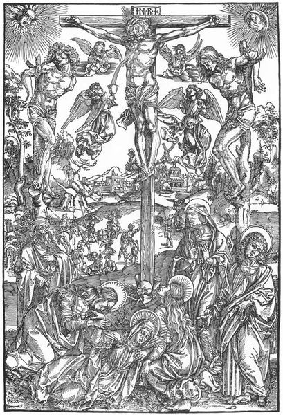 Albrecht Dürer etched "The Lamentation for Christ" in ink on paper, capturing a scene laden with profound sorrow. Observe the motif of lamentation, most clearly represented by Mary holding her son, a gesture echoing ancient mourning rituals. This symbol transcends time, resurfacing in depictions of grief from antiquity to the Renaissance and beyond, linking personal loss to a universal expression of sorrow. Recall the sculpted Pietàs, where Mary cradles Jesus’ body in sorrow, a theme resonant across cultures. The grieving figures express inner turmoil, engaging our collective memory of suffering. Note the crown of thorns discarded near Christ's feet, an emblem of humiliation and sacrifice, prefiguring themes of martyrdom. The non-linear progression of such iconography reveals cultural memory and the psychological weight of symbols, connecting us to shared experiences of pain and hope across generations.