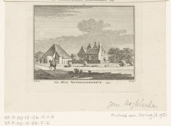 Editor: This etching, “Gezicht op het kasteel Huis te Watervliet,” made by Hendrik Spilman around 1743, has a beautifully serene quality. The formal layout of the building and landscaping, the stillness of the water... it all feels very balanced. What do you see in this piece? Curator: Focusing purely on the composition, note how Spilman utilizes line to create depth. The linear perspective, while not perfectly scientific, establishes a clear foreground, middle ground, and background. The regularity of the trees bordering the path on the right establishes a rhythmic structure. And how do you read the balance between the textures? Editor: Textures? Well, there's the smooth water contrasting with the meticulously etched details of the building and trees. The sky seems like empty space to add balance. Curator: Precisely. Notice, though, that the apparent 'emptiness' is also achieved through etching; Spilman is purposefully creating the distinction through technique. It gives emphasis to the intricacy found within the constructed environment. It would not exist without the surrounding flat space, wouldn't you agree? Editor: I do see it now; it defines it, providing contrast. Curator: Indeed. The balance achieved in the textures of the sky, water, landscaping and structure highlights how formalism emphasizes visual elements without immediate consideration for history. A different interpretive perspective might bring out further details of history or cultural context. Editor: It’s fascinating how much you can unpack just by observing the visual structure itself! Curator: And it demonstrates the crucial link between artistic choices and formal reading.