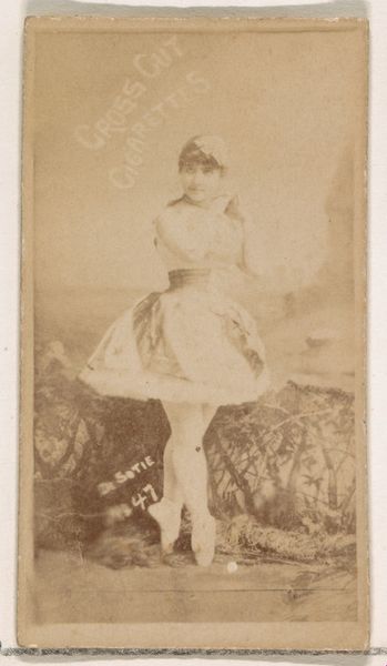 Editor: Here we have a print from Goodwin & Company, dating between 1886 and 1890. It's called "Mlle. Legrande, Paris, from the Actors and Actresses series (N171) for Old Judge Cigarettes." It feels quite delicate, almost like a faded memory. What strikes you about this piece? Curator: What I see is a fascinating intersection of commerce and art. We need to look at the materiality of this object - a card produced to sell cigarettes. Consider the labor involved, from the photographers to the printing process, and the tobacco farmers themselves. How does its function as advertisement shape our understanding of this image of Mlle. Legrande? Editor: That’s a good point. So it's not just a portrait, but also part of a bigger industry? Curator: Exactly. The mass production of these cards created a demand, fueled by capitalist motives. Think about the social context of collecting – what did owning this card signify? Who had access to it? Editor: So, it's about access and consumption. How does seeing it that way change how we think about Mlle. Legrande herself? Curator: We must view her not just as an individual, but as a commodity herself. She is participating in a system that profits from her image, promoting an aspirational lifestyle connected to smoking. The blurred aesthetic quality also suggests the fleeting nature of fame and its inherent consumability. Editor: This has completely changed my perspective! I was initially focused on the artistry, but the materialist approach really highlights the power dynamics at play. Curator: Precisely. By examining the material and the process of production, we unlock a far richer understanding of the artwork and its place within a broader economic and social landscape.