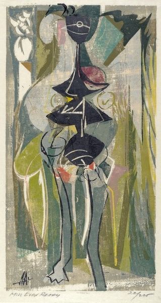 Editor: So, this is Stanley William Hayter's "Combat," an etching from 1953. It's a very dynamic, abstract piece. There's so much energy! How do you even begin to interpret something this abstract? Curator: The title is a good starting point. Think about what "combat" evokes – conflict, struggle, energy. Now, look at the lines. They're not just decorative; they intersect, overlap, almost clash. Do you see any visual metaphors that resonate with the idea of struggle? Editor: Well, the lines definitely feel chaotic, like things are pulling in different directions. And some of the forms, though abstract, are vaguely aggressive. The spiky shapes, for example. Curator: Exactly. Hayter was deeply interested in the subconscious. He believed abstract forms could bypass our rational minds and speak directly to our emotions. This etching was created not long after the Second World War ended. How do you think the trauma and upheaval of those years might be relevant to Hayter’s aesthetic here? Editor: I can see that, given when it was made, "combat" takes on another layer. These clashing lines become a representation of the social and political chaos of that time, of conflict, both inner and outer. Curator: Precisely. Even the colours - the pink fighting against the blue - heighten the sense of unrest. Visual imagery often draws upon the subconscious. Consider that the colour of human blood might be the real point of origin for this image! It asks you to confront something unsettling. Does the imagery make you consider a need for social reform? Editor: Absolutely. I initially saw just abstract lines, but now I see the layers of meaning embedded in them – history, emotion, even a call to action through the cultural memory of what Hayter lived through. Curator: And that's the power of symbols, to hold and transmit meaning across time. A work of art such as this shows how personal experience informs how our cultural memory can affect future generations, too. It is also important to think about the psychology of colour, line, form, space, and texture in relation to the images’ possible impact upon a viewers’ overall impression of a work such as this!