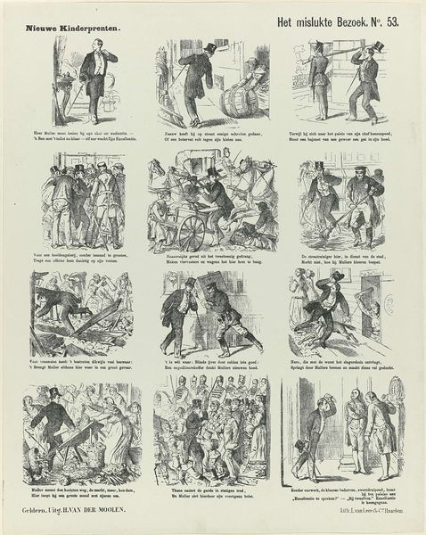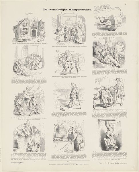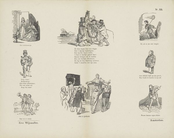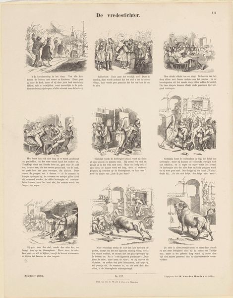 This is a print made by R.T. Powney, featuring six different scenes, rendered in a detailed, monochrome style. The layout, a grid of vignettes, creates a structured reading experience, almost like panels in a comic strip. Each scene uses sharp contrasts between light and shadow to define forms and evoke specific moods. This play of light, or chiaroscuro, is not just a visual technique but a way of structuring narratives within each panel. The rigid structure, with its clean lines and geometric divisions, invites us to consider how it organizes and presents its stories. Powney's print isn't just a collection of scenes; it is an exploration of narrative structure. The grid format prompts us to look for relationships and contrasts between the different scenes. The artwork engages with the broader questions about how we perceive and organize information. This print challenges the notion of art as a singular, unified statement and proposes it as a series of interconnected fragments.