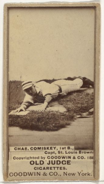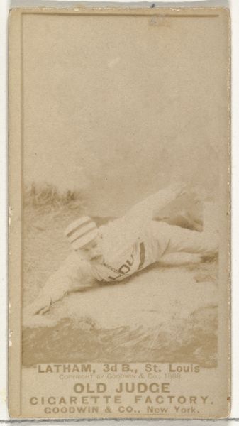 Curator: This is a baseball card, part of the "Old Judge" series, dating back to 1888. It features William H. "Yank" Robinson, a shortstop for the St. Louis Browns. The card, created by Goodwin & Company, was originally included in packs of Old Judge Cigarettes. Editor: The sepia tone really emphasizes its age. And I’m struck by the pose. He’s all out, diving! It captures the physicality of the sport in such a raw way. It's more action shot than stiff portrait, which feels unusual for the time. Curator: That’s right. Think about how baseball was professionalizing at the time. These cards helped popularize players and teams, shaping early fandom. What I find intriguing is that these weren’t viewed as fine art; they were commercial products, mass-produced for distribution with cigarettes. Editor: Absolutely, and the cigarette connection is critical. Tobacco companies leveraged burgeoning sports culture to push their products. We have to consider this image within a system of manufacturing and consumption. The card's materiality tells that story - from the photography, the printing process, the very paper it’s printed on. The fragility implies disposability, but obviously some survived, shifting their function entirely. Curator: Yes, it really illuminates the complex interplay between commercial interests, photographic technology, and the burgeoning popularity of baseball in late 19th century America. Editor: I also see hints of ukiyo-e influence here, a genre of Japanese woodblock prints— particularly in the flat perspective and emphasis on a fleeting moment. It reminds me that cultural exchange happened on a micro-level even back then, shaping artistic output unexpectedly. Curator: That's an insightful observation! And certainly, the card transcends its initial purpose. It acts as a window into the social and economic forces at play during that period. A really great intersection of advertising and celebrity. Editor: It prompts a deeper look into how art, craft, and mass production intersect. By seeing what seems disposable reframed and valued, we also reframe our own present values and what of it survives. Curator: Precisely. This card offers insights far beyond the baseball diamond.