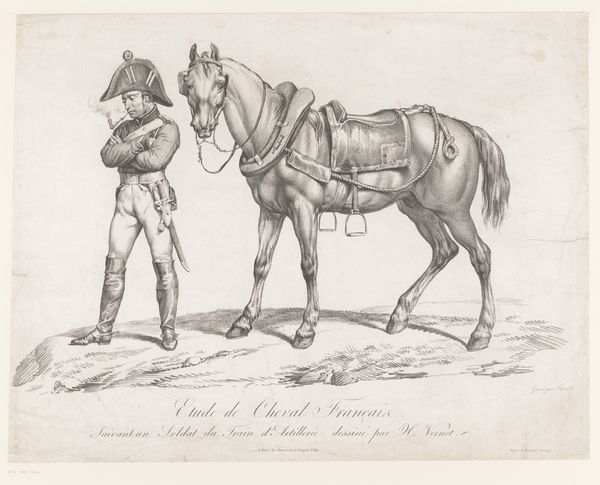 Curator: Look at this delicate piece by Jean Pierre Marie Jazet, dating roughly from 1799 to 1871. It's called "Soldaat in Rusissche klederdracht bij zijn paard", currently held here at the Rijksmuseum. Editor: There's a captivating stillness to this work, almost dreamlike. The subtle use of line creates such a softness in the horse’s form, and the detail in the soldier’s clothing. What was Jazet aiming for here? Curator: Jazet was clearly interested in depicting material culture, notice the meticulous rendering of the soldier's armor, the specific design of the horse's saddle. There’s real attention paid to representing Russian dress and equipment, documenting ethnographic details through his artistry. Editor: Precisely. It speaks to the time, doesn’t it? The European fascination with exotic cultures and the growing accessibility of travel. How do you think these kinds of depictions impacted the general public's perception of other nations at the time? Was it purely observation, or was there some ideological slant? Curator: Hard to say, but clearly a hand-drawn study like this provides a sense of ‘authenticity.’ He’s inviting us to look at the texture of the clothing, the crafting of each item of gear – pointing to the labour involved, to its social construction. The image carries authority from that material perspective. Editor: Authority perhaps, but also perpetuating certain perspectives. Is this image serving a role in a broader political landscape by reinforcing stereotypes or exoticizing this figure and his horse? How does this individual soldier function within the wider visual economy of 19th-century imperial projects? Curator: A valid question. Perhaps the artist hoped simply to capture something unique? Nevertheless, the political ramifications of representing 'the other' can't be discounted in the cultural milieu of the time. Editor: Indeed. Considering the work in the context of display within the Rijksmuseum as well…it asks even bigger questions. I see so much layered complexity packed within this seemingly straightforward scene. Curator: It reminds me how art constantly intertwines tangible representation with historical context to create new understandings of material life. Editor: Agreed. Every object, every image has the potential to re-write the script!