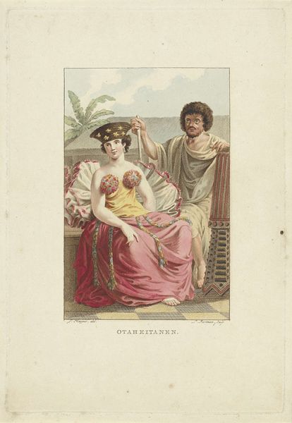 Editor: This is "Echtpaar bij hun hut in het veld," made in 1805 by Ludwig Gottlieb Portman, currently held at the Rijksmuseum. There's a palpable tension; the man is on alert, rifle raised, while the woman calmly weaves. How does this image speak to the societal context of the time? Curator: This image is more than just a domestic scene; it's a carefully constructed representation intended for a European audience. The 'noble savage' trope is strongly at play here. Note the man’s posture – vigilant, armed – versus the woman engaged in domestic craft. Consider who commissioned this image and what narrative they were trying to promote about indigenous populations and their relationship to colonial power. Editor: So it’s less a depiction of reality and more of a…performance? Curator: Precisely. Think about the artist's choices: the exoticized clothing, the juxtaposition of labor and protection. How might the placement of this image in a museum setting contribute to its meaning today? How might a contemporary indigenous artist respond to this depiction of their ancestors? Editor: It’s unsettling to think of this image being used to justify colonial narratives, yet it lives on in the museum, perpetuating those views. Curator: Indeed. Museums play a vital role in critically examining their collections. How can we recontextualize this work to acknowledge its historical baggage and empower a more accurate, respectful dialogue about the depicted cultures? Editor: I never would have considered this beyond just an historical scene. The museum’s responsibility to the communities depicted really shifts my perspective. Curator: That critical lens, recognizing the power dynamics embedded within artistic representations, is key to understanding art history.