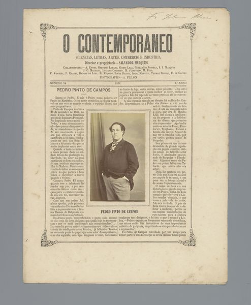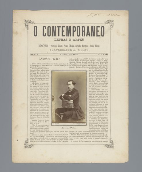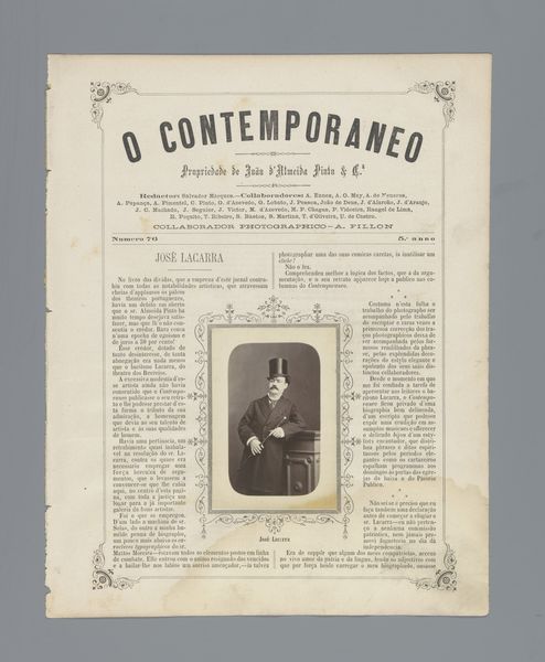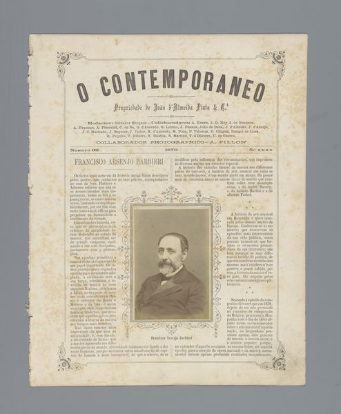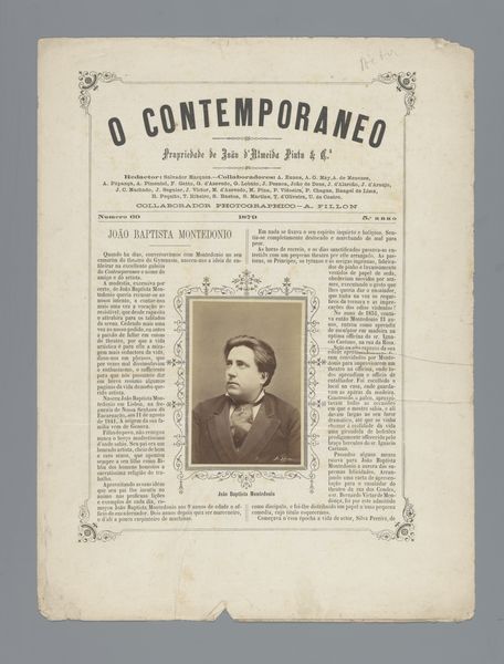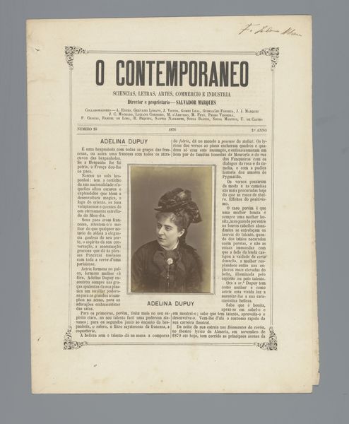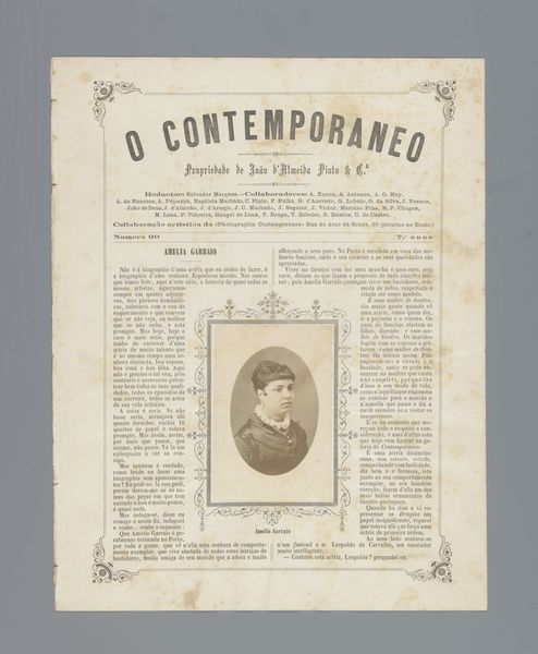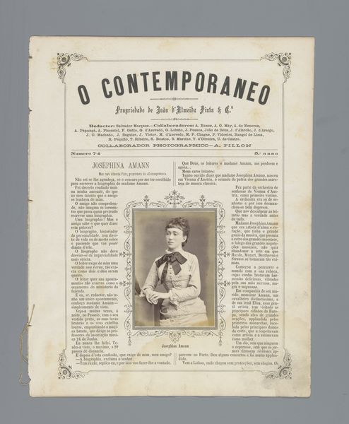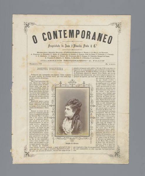 Curator: So, this is "O Contemporaneo," which features a portrait of Josefina Amann, probably before 1879, and done through photography and printmaking. It's so much more than just a picture in a newspaper. Editor: Absolutely. There is a very dreamy quality to the print itself, almost as if you were to pick it up it would be as soft as smoke. What catches your eye when you look at it? Curator: Well, the layered meaning fascinates me! This is a reproduction of a photo within the pages of a journal called “The Contemporary.” Back then, photography was still magical. Each reproduction was almost an echo, a faint dream of the original. I am also quite captivated by her. I think back to my favorite poem by Pessoa "Opiário". Does she remind you of anyone? Editor: A little bit! There's a real quiet strength in the way she gazes just beyond us. Almost confrontational and questioning. She looks to be in the beginnings of great discovery of herself as well. Do you think there's any particular reason they put her in the magazine at this moment? Curator: This image must have really captivated someone to memorialize this young lady. To your previous question about what caught my attention - the image placement of Josefina placed delicately with adornments from what looks to be writing. How incredible to preserve. Now that we spent all this time pondering what our perception means.. I wonder about others who knew Josefina - or even just passed her by in a shop or at a party. Editor: Yes, exactly, who else took notice, and what did they notice! A thought to follow later, but yes what a beautifully preserved moment! Curator: I think you just made the artwork speak beyond its borders - Bravo!