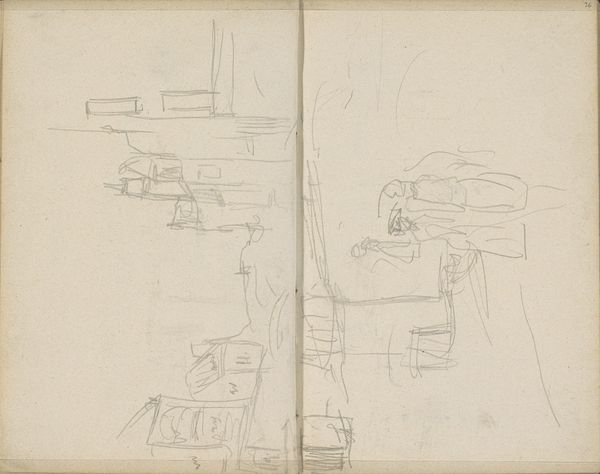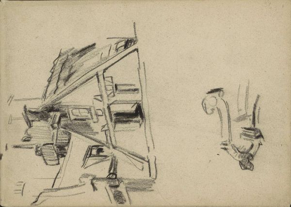 Editor: Here we have Teutwart Schmitson’s "Studienblatt_ Figuren, Objekte, ein Haus und ein Rind", a drawing on paper from the Städel Museum collection. It feels almost like a page torn from a sketchbook, showing a jumble of figures and objects. What strikes you most about this work? Curator: Well, immediately I see the raw materiality of the piece – the paper itself, the marks made upon it. These sketches, seemingly disparate, reveal an artist engaging with the very act of production. The house, the figures, the ox - they're all subjects undergoing a process of material transformation through the artist's hand. Look at how he renders the wooden implements, almost lovingly. Do you think the choice of such mundane subjects is deliberate? Editor: It's interesting you focus on the materiality. I suppose I hadn't considered the objects themselves as being that significant beyond their representative function. Is that a comment on the shift away from idealized subjects in art, perhaps? Curator: Exactly. It pushes us to think about the labor involved in depicting these items, the cultural context that imbues them with value. The house isn’t just a house; it’s shelter constructed through labor, represented through the labor of drawing. These elements raise interesting questions about the relationship between art, labor, and the everyday objects of our lives. And it certainly prefigures later shifts toward incorporating found objects and valuing process over finished product. How do you see the artist’s hand in relation to the representation? Editor: I hadn’t really thought about how this connects to the later emphasis on the artist’s process. It’s amazing to consider this drawing not just as a preliminary sketch but as a document of its own making. Curator: Precisely. It blurs the line between ‘high art’ and the work of everyday life. Perhaps this focus shifts our awareness toward valuing not only the representation, but the conditions that gave rise to both the subject matter, and its eventual representation.