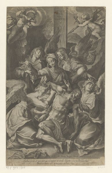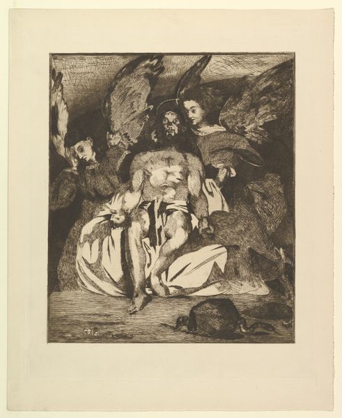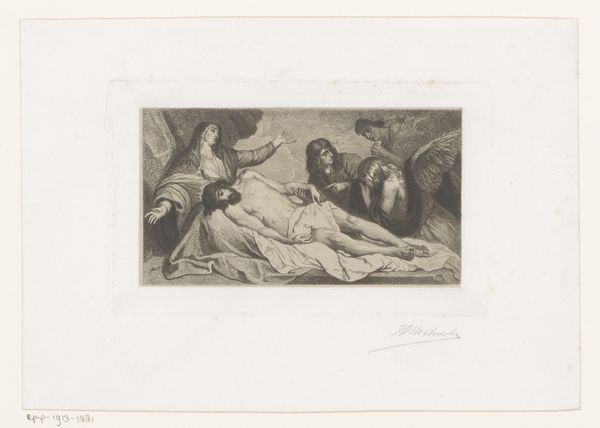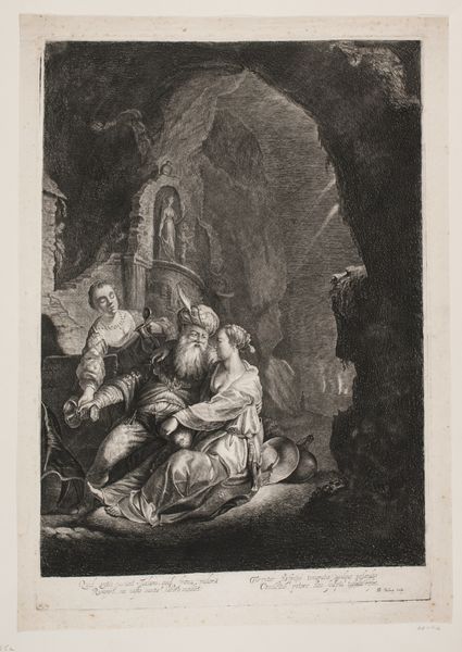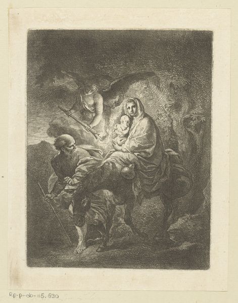 Curator: It seems that what we have in front of us is “Ouders treffen hun slapende dochter aan in een vissershut”, from 1771, made with ink and charcoal, on paper. The artist is Jean Baptist Leprince and it resides in the Rijksmuseum. There’s a compelling narrative element to this work, but the figures appear somewhat ghostly. What strikes you most about it? Editor: I'm drawn to the contrast in textures—the rough-hewn nature of the shack versus the soft depiction of the sleeping figure and her linens. What does the material reality of this piece—ink and charcoal on paper—tell us about the social context of its creation? Curator: The choice of drawing, as opposed to a painting, speaks volumes about accessibility and function. Ink and charcoal are relatively inexpensive, and paper allowed for reproducibility. Think about who would have been consuming such images in 1771. Was it for elite collectors or a broader public? And what narrative needs was Leprince responding to? Editor: Perhaps the story itself was meant to be circulated widely. It is very interesting that those are not the "noble" materials generally seen, I wonder if those were available to all social classes. Do the fishing hut setting, the sleeping girl and her concerned parents…do these figures represent archetypes for the intended audience? Curator: The setting places the narrative in a world of labor and resource extraction – the fishery. Look closely. What can you infer from the still-life elements in the bottom left: The basket and its contents? And consider how the scene is staged as a ‘discovery,’ suggesting themes of vulnerability and perhaps even morality, being circulated for a rising merchant class with a growing sense of domesticity and concerns about family. The very act of Leprince creating multiple versions, allowed these bourgeois moral concepts to filter down and to spread, as they were consumed. What do you think? Editor: That’s insightful. I see how the relatively cheapness of this production parallels with the rise of a new social order interested in different stories. Looking at it now I also agree that is meant for the family unit of that time. It puts things in context that otherwise, would have seemed random or disconnected. Curator: Exactly! Examining the materials and their accessibility allows us to unravel not just the story *within* the artwork, but also the story *of* the artwork, its place in the economic and social fabric of its time.