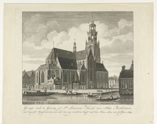 Hendrik Altmann created this lithograph of the Sint-Laurenskerk in Rotterdam in the 19th century, employing delicate lines and tonal variations to render the architectural grandeur. The composition is anchored by the imposing structure of the church, its verticality emphasized by the towering spire and intricate gothic details. Light plays a crucial role, casting shadows that delineate the volumes and textures of the stonework. The artist contrasts the static monumentality of the building with the dynamic, horizontal flow of the river in the foreground, populated with boats and figures that add a human dimension to the scene. The image invites a semiotic reading: the church, a signifier of religious and civic authority, is juxtaposed with the bustling river, symbolizing commerce and the everyday life of the city. This interplay suggests a negotiation between the sacred and the secular, the monumental and the mundane. The print is not merely a depiction of a building but an exploration of the relationship between architecture, society, and the ever-changing currents of history.