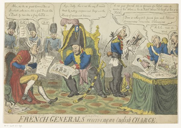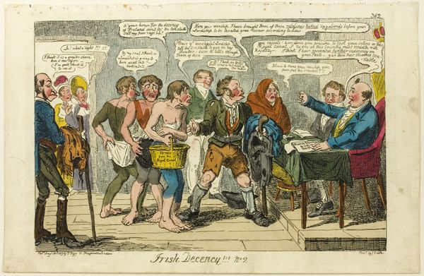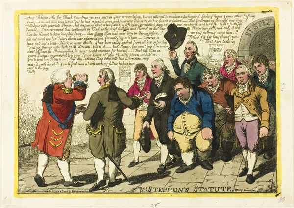 This print from 1821, made by an anonymous artist, caricatures King George IV's interaction with Irish dignitaries. The figures are adorned with symbols of authority: royal robes, ceremonial chains, and the crown, which in this instance, are employed ironically to underscore the perceived impropriety of the King's behaviour. Note the motif of kneeling. Here, it is meant to symbolize supplication and respect. Yet, if we delve into history, we see kneeling appears in numerous contexts: religious iconography to denote reverence, or, like here, political art to comment on submission. Think of the countless images throughout history where posture and gesture dictate power dynamics. Observe how, through caricature, the artist has engaged with the collective memory of royal decorum, contrasting it with the scene depicted. This approach evokes not just laughter but also a deeper, subconscious recognition of societal norms and their subversion, a dance between expectation and reality played out on the stage of public perception.