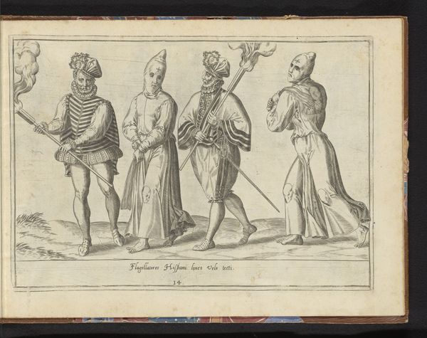 Editor: So, this engraving, "Four Eastern Men, Dressed According to the Fashion of around 1580," by Abraham de Bruyn, at the Rijksmuseum... It's fascinating how detailed their garments are. What symbols do you see in this image, and how do they tell a story? Curator: The symbolic language here speaks volumes about cultural understanding and, perhaps, misunderstanding. Consider the deer accompanying the figure on the left. What associations do we have with the deer as a symbol? Editor: Innocence, maybe? Something to be hunted? Curator: Exactly. And how might that perception play into the artist's representation of these "Eastern Men?" Then observe the objects each figure carries: a small hammer, pouches... These are all performative signifiers meant to signify specific cultural roles. The banners could be emblems of status and leadership within their community. What assumptions might viewers at the time have made based on these symbols alone? Editor: That they're exotic... maybe a bit dangerous? There's definitely an element of othering. Curator: Precisely. And by dissecting those assumptions, we can learn a great deal about the cultural lens through which these individuals were being viewed and the narrative the artist intended to convey through such choices. What do you make of the deer accompanying a man who wears a Turban, what emotional valence does that layering evoke for a contemporary audience? Editor: It feels like a commentary on cultural exchange and the potential for misinterpretation that has me thinking deeply about what cultural memory endures in these symbols and images. Curator: Absolutely. The image preserves a particular moment in history. These symbols trigger deeper thoughts about enduring cultural relations and the continuous reinterpretation of cultural symbolism throughout history.