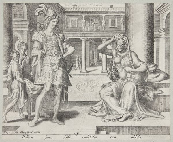 Editor: So, this is Philips Galle's engraving, "Saphan reading the Book of the Law to Josiah," from around 1567 to 1570. It's striking how the artist uses line to create such detail, almost a crowded effect. What historical perspectives can you offer on a piece like this? Curator: Well, consider the Reformation's impact. The widespread availability of printed material, like this engraving, fueled new interpretations of religious texts. How do you think the artist's choice to depict this specific biblical scene relates to that social context? Editor: It's interesting because it places emphasis on direct access to scripture, right? Instead of solely relying on the Church's interpretation, the people, through Josiah's leadership, are engaging with the text themselves. Curator: Precisely! The printing press allowed for broader engagement with these stories. The act of Saphan reading aloud is about asserting authority and propagating religious doctrine within a rapidly changing cultural landscape. Look at Josiah on his throne – how does his body language and placement contribute to the engraving's overall message? Editor: He looks somewhat contemplative, maybe even overwhelmed? I wonder, was this print intended as a straightforward religious lesson, or something more politically charged? Curator: The Northern Renaissance, where Galle was active, saw art functioning often in the service of religious and political agendas. This engraving probably aimed to instruct but also to reinforce certain power dynamics of the era and comment on ideal leadership. These historical images are never neutral; they are carefully constructed to impact public consciousness. Editor: That makes me rethink how I initially viewed this work. I was too focused on just the aesthetic. I hadn’t considered how potent this kind of image would be during that specific time period, with religious reform movements happening. Curator: And understanding that historical impact makes this so much more than just an image, it becomes a lens for seeing a very transformative time.
