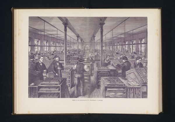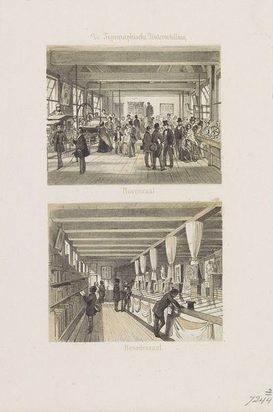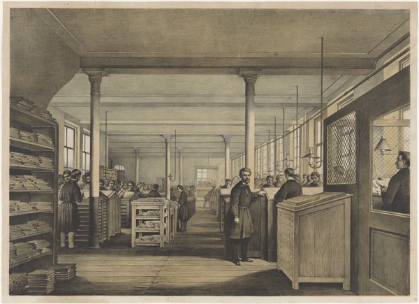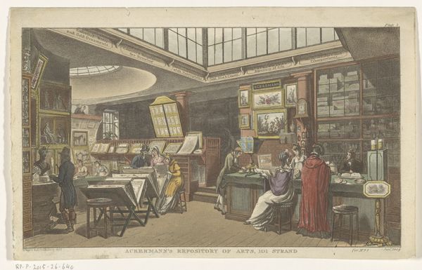 Curator: This engraving from 1826, whose creator is anonymous, offers us a glimpse into the "Veilingzaal van Thomas Price in de Assembly Room te Cheltenham," or the auction room of Thomas Price. It’s rendered on paper. Editor: My first impression is one of meticulous detail. Look at the precision in capturing the architectural space and the social dynamics of the scene; even the fall of light feels considered, creating an overall impression of contained order. Curator: It's intriguing how this print intersects with broader narratives of 19th-century society. Notice the assembly room filled primarily with what appear to be affluent members of the community. This space embodies economic transactions and power dynamics but also speaks to the increasing importance of leisure and social gathering amongst the rising middle class. Editor: Absolutely, and the structural repetition throughout—the rows of desks, the regularly spaced windows—enhances this idea of order and control. See how these strong horizontals are offset by vertical lines, subtly suggesting a hierarchical social arrangement. The artist employs visual techniques to reinforce power. Curator: Consider also the role of gender. Observe how women occupy positions within the audience, participating in commerce and asserting their presence within the public sphere. Even seemingly passive representation becomes an active negotiation for access and influence within traditionally male-dominated spaces. Editor: That's a keen observation. Zooming in, the fineness of line employed here—especially within the costumes and furnishings—emphasises textures and conveys not just the aesthetic but the tactile sensation of luxury. There’s a visual commitment to detail, inviting sustained looking. Curator: I agree; what truly stands out is how such depictions of wealth also touch on more subversive narratives: examining the commodification of social status and class distinctions and ultimately allowing us to critique them from a modern perspective. It raises poignant questions about inclusivity within these spaces, as well as questions concerning those who have historically been denied such access. Editor: Looking at this, I’m left admiring how effectively formal arrangement and the nuances of detail coalesce here into a powerful commentary of their own accord. Curator: Yes, reflecting upon the convergence between class, gender, and public spaces through something seemingly commonplace.