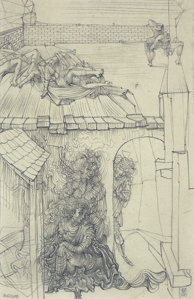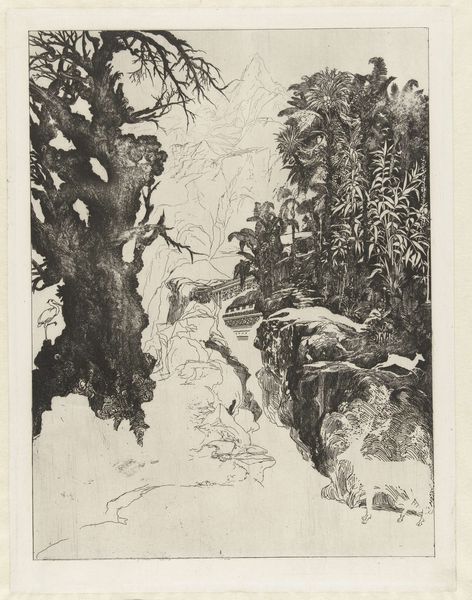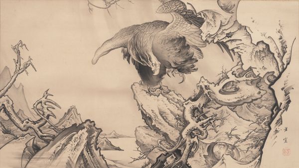 Editor: This intriguing woodblock print, titled "An older woman hits another woman with her shoe" and created by Katsushika Hokusai, presents a rather unusual scene. I’m immediately struck by the stark contrast between the chaotic action and the serene landscape. What structural elements guide your reading of this image? Curator: Formally, the composition employs a dynamic asymmetry. The right side, dominated by the towering figure and stone sculpture, presents a dense, almost baroque visual texture, in stark contrast to the left, where the slender trees offer a receding, linear perspective into a calmer, more open space. The use of line, particularly in the depiction of the women's garments, generates an intense visual rhythm. What purpose do you think the contrasting densities on either side serve? Editor: Perhaps it's meant to highlight the instability caused by the violent act itself, disrupting an otherwise balanced and orderly world? It seems the action pulls all the focus. Curator: Indeed. Note how Hokusai utilizes the starkness of the monochromatic palette. The lack of color directs the eye towards the variations in tone and texture. The graphic quality further amplifies the dynamism, freezing a moment of raw, unbridled emotion within a meticulously constructed formal framework. We also cannot ignore how the swirling cloud-like carvings on the stone add to a vortex of movement, compared to the static house in the background. How do the placement and angle of the women in the artwork guide your eyes through the space? Editor: Now that I look, their poses seem to make two diagonal lines facing the center. The bending figures form a compositional pull between each other as the tension builds in the middle of the scene. Curator: Precisely. A tension realized, made only more fascinating in this relatively still scene of a complex image! Thank you for lending your gaze and observations to the image, too. I feel as if my understanding of semiotic language and composition has only further broadened as well.
