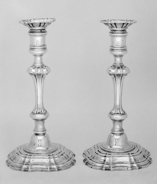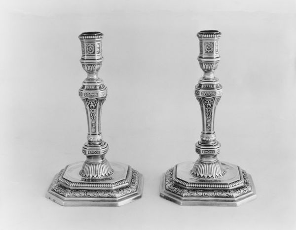 Curator: Let's turn our attention to a remarkable example of Baroque craftsmanship. This candlestick, made from silver, is part of a set of four crafted by Johann Daniel Schäffler I, sometime between 1701 and 1705. Editor: It has such a restrained elegance, doesn’t it? The way the light catches the metal... it feels simultaneously solid and ethereal. Curator: The form certainly plays with these tensions. Note the geometric facets of the central column contrasting with the elaborate foliate designs on the base and knops. It embodies the Baroque love of ornamentation, yet the overall structure remains rigorously symmetrical. Editor: It's interesting how these decorative objects also played a social role. Who owned objects like these and how might the soft light they produced have impacted their gatherings, creating both warmth and an intimacy, restricted to those wealthy enough to obtain precious materials. Curator: Exactly. This piece speaks volumes about the prevailing aesthetic tastes and economic disparities of the period. One can analyse it structurally, in terms of its design elements, the interplay between positive and negative space in its floral elements. Editor: Absolutely, and consider how such an artifact reifies and makes physical the dominant political regime that sanctioned luxury. Objects like these reflected, and reinforced, those social hierarchies, creating boundaries in the domestic sphere and offering insight into performative power relations. Curator: Indeed. Looking at it now, the eye is drawn to how the metal interacts with its function: a simple vessel elevated to a statement of wealth and status. It achieves remarkable poise in its ornate, vertical ascent. Editor: Right, thinking about it in this broader context changes how I look at it; no longer just decorative art but part of something more structural and political. Curator: Precisely, a rich object deserving careful, repeated viewings. Editor: It is. These close viewings really have encouraged us to rethink the piece and its context.