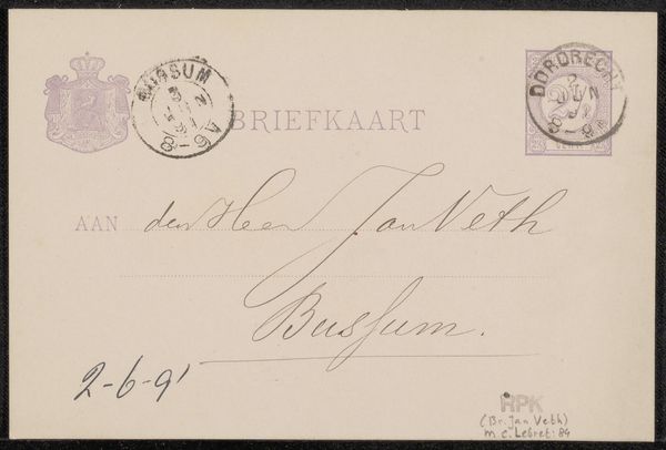 Curator: It feels ephemeral, doesn't it? Like a whisper across time. Editor: This is "Briefkaart aan Jan Veth," or "Postcard to Jan Veth," attributed to M.C. Lebret, and likely dating from the late 1890s. It's a pen and ink drawing on paper. Curator: Ephemeral, yes. The delicate script, the fading ink…it feels intensely personal. It is so understated that it is quite moving, really. Like catching someone else's fleeting thought. I imagine receiving something like this must've felt…well, intentional. Editor: I agree, and I think it invites us to consider the relationship between Lebret and Jan Veth. Veth, himself a notable artist and critic, was part of a late 19th-century art scene deeply engaged in debates about national identity, aesthetics, and the role of the artist in society. A postcard wasn't just a casual greeting then; it could be a declaration of artistic and intellectual affiliation. Curator: Absolutely! There's a certain formality in the address "Aan den Weledelgestrengen Heer," ("To the most honourable sir"), a level of respect one doesn’t really encounter on a postcard anymore! Do you think this was a commission? Editor: Possibly! There's also a strong suggestion of class here. Literacy, access to materials, leisure time to write – these all speak to a certain level of privilege, perhaps used to address social inequality. The art world, then and now, has always been deeply implicated in questions of power and access. And also consider how this simple everyday item of the printed form, combined with the personalized graphic elements, hints at a world undergoing rapid modernization. Curator: That's astute. I suppose in our own age of instant communication, we've perhaps lost some of that… that delicious sense of anticipation that a handwritten note brings, a physical connection to the other. Editor: Perhaps. But in some ways, aren't we also crafting these digital messages, imbuing them with meaning, using technology to express the personal in ways we're still exploring? The technology changes, the need for connection does not. Curator: Beautifully put. Makes me want to pen a postcard to someone. Or maybe just buy some nice stamps… Editor: It reminds us that even seemingly mundane objects can hold immense historical and artistic value.