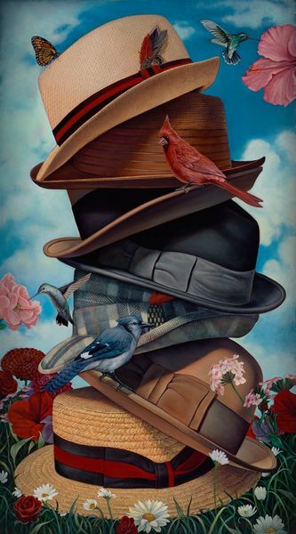 Danny Galieote's "The Garden of Life" is a painting built from layers of oil paint, each meticulously applied. Here, paint becomes a means of rendering the textures of life itself. The hats, rendered with tight, controlled brushwork, stand in contrast to the lush, almost explosive quality of the surrounding flora and fauna. The artist coaxes out the subtle gradations of light and shadow on the woven straw, using precise techniques to create depth and form. The profusion of flowers, leaves, and creatures is conjured through a slightly looser touch, yet each element retains a sharp definition. Galieote seems to deliberately blur the boundaries between observation and invention, between the real and the imagined. The finished artwork is a testament to the transformative power of creative labor, where the artist's skills can create a world within a world. Seeing how the artist engages with and manipulates their materials allows for a deeper appreciation of the artwork's concept.