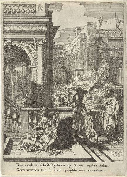 Curator: I find myself immediately drawn to the density of information here. So much to unpack in the image, "Louis XIV Visiting the Royal Academy of Sciences". Editor: The visual texture alone is striking; such meticulous detail achieved through etching and engraving! A real demonstration of craft skill. But look how this image acts like propaganda— Curator: Exactly! Produced in 1671 by Sébastien Leclerc I, it places the King at the heart of intellectual life. We're meant to see the monarchy as a patron, even an instigator, of scientific progress. This room, teeming with activity… Editor: Overflowing with symbolism of labor! Every object displayed and human form present meticulously drawn: instruments, blueprints, specimens—tangible representations of knowledge-creation and scientific advancement as industry. All resources employed in the pursuit of progress! The print's very production… Curator: Was surely intended for wide distribution. And what better endorsement for The Academy than a royal visit presented as a mark of prestige. Editor: Absolutely. Royal patronage legitimized academic activities and fueled scientific innovation as much as labor; how reliant academies have been upon wealthy industrialists! We must view such historical funding carefully because it shapes production capabilities in this field... What does the view suggest? Curator: From the orderly, classical gardens beyond the windows to the display of a human skeleton within, Leclerc frames the Academy within a classical tradition and a modern impulse toward scientific study. Also consider, who controlled access to spaces like the Academy? Who benefited, whose labor was extracted? Editor: The power structures at play within even the pursuit of what was thought of as disinterested scientific inquiry; interesting that labor would construct something of value on any class standing to be received as 'high art.' Curator: That's a keen observation to end with; power dynamics always have a material component! Editor: And now I’m keen to reconsider the work the craftspersons would need to contribute!