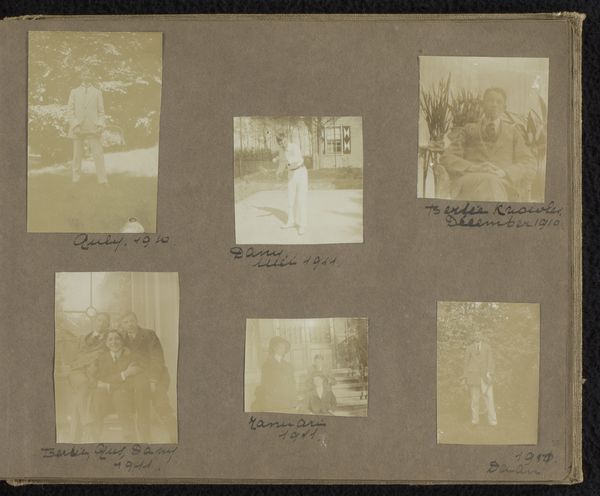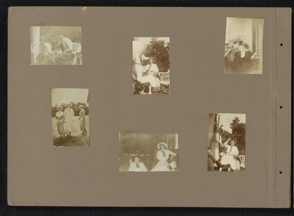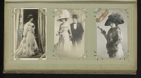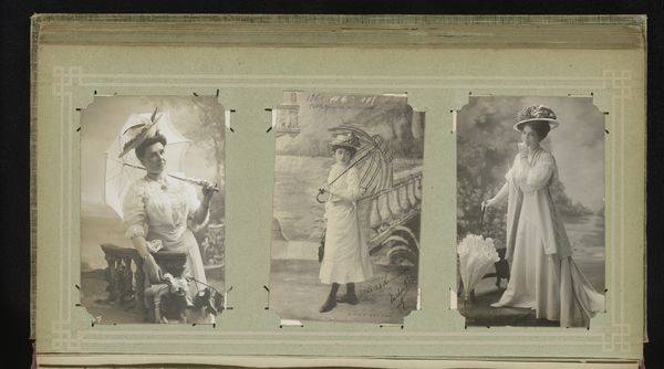 Curator: This photo album page holds three albumen prints known as “Drie portretten van Marie Studholme,” likely taken between 1900 and 1930 by R.W. Thomas. Editor: My immediate response is nostalgia; the faded sepia tones and composition evoke a longing for a bygone era. Curator: These portrait studies of Marie Studholme each offer glimpses into performative femininity through genre scenes. Take, for instance, the left frame where she interacts with a bird in a gilded cage, a visual metaphor for a kept woman, yet rendered gently through pictorialist softness. Editor: That's interesting, especially considering the slightly blurry aesthetic quality which is quite evocative. Note the intentional soft focus that almost dematerializes the figure, blending her with the surrounding foliage. The composition, too, with its framing within the album, further accentuates the image’s planar qualities and emphasizes the inherent artificiality of it. Curator: Indeed. We see Studholme playing different versions of herself: pampered socialite, lady of the manor by her pony, or reclining debutante. All are images intended to evoke very precise meanings about social class, aspirations and a specific type of ideal womanhood that has its roots deep in earlier concepts of beauty and behavior. It makes me think of other representations of women at leisure from much earlier ages! Editor: The stylistic approach to the use of albumen, in these prints, adds a very tangible quality, with a certain delicacy and lightness to these photographic renderings. Curator: Seeing this triptych as a whole highlights the performative aspect. We can see different modes of posing. What do you take from that as a Formalist? Editor: I appreciate the dialogue between the soft, almost ethereal tones, the staging of the sitter and the fact of a very clear sense of construction. There is certainly the clear understanding, from a technical perspective, of pictorial strategies which make for a series of powerful compositions. Curator: Absolutely. I walk away appreciating how the arrangement, the subject, and the technical qualities all reinforce and deepen the messages these photographs convey about social norms, aspirations and the elusive concept of beauty. Editor: I agree. It really underlines the intersection of technique, social performance, and individual character in these photographic artifacts.