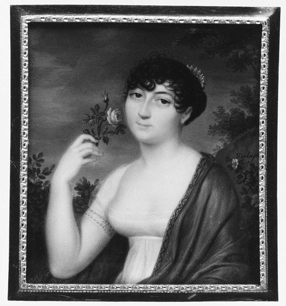 François-Théodore Rochard painted this "Portrait of a Woman" with watercolor on ivory in the 19th century. Watercolor painting on ivory was a prized, meticulous skill, demanding precise brushwork. The artist worked with delicate ivory as a support, layering translucent washes to build up form and color. This miniaturist technique involved considerable labor and patience to achieve a convincing likeness. The small scale and precious materials indicate that this was an intimate object, meant to be held and treasured. It reflects the rise of a wealthy merchant class, who could afford such luxury items. Rochard’s technical skill placed him within a network of artists who supplied an elite market with portable, personal keepsakes. Ultimately, this portrait serves as a reminder that even seemingly straightforward images are the result of skilled handwork and social conditions. Recognizing the labor, materials, and cultural context involved allows us to appreciate its full meaning, and to move beyond conventional notions of art historical value.