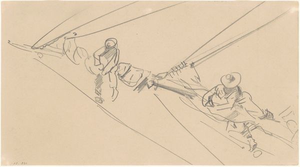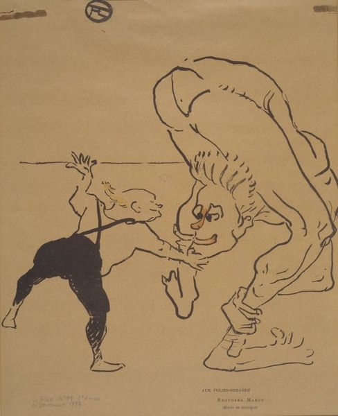 This untitled drawing by the group known as Kukryniksy presents a stark visual statement through a caricature. Executed with stark lines and contrasts, the composition immediately draws the eye to a distorted figure astride a broom, clearly identified as Hitler. The drawing's structure hinges on this exaggerated figure and dynamic pose, with another figure clinging on. The use of a broom as a vehicle is a powerful semiotic device, undermining the subject's authority and reducing him to a figure of ridicule. We see the hat, emblazoned with a swastika, flying off, which further symbolizes a loss of control. The map below suggests a reference to specific geopolitical failures. Kukryniksy use line and form not just to depict but to critique, using caricature to destabilize the terrifying image of the Nazi regime. The aesthetic choices serve a larger cultural discourse, reflecting a wartime strategy of derision aimed at dismantling the aura of power surrounding the Axis leaders.
