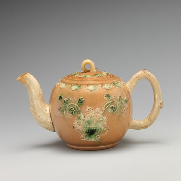 This is an Ott and Brewer teapot, likely made between 1871 and 1893. The eye is immediately drawn to its round form, softened by the delicate, creamy glaze that gives it a tactile, almost organic feel. The gilded ornamentation seems to float on the surface, catching the light and adding a layer of opulence. The composition strikes an interesting balance between order and asymmetry. The vertical reeds create a sense of rhythm around the teapot, while the scattered leaves disrupt the pattern with their varying sizes and orientations. This interplay evokes a feeling of controlled nature, a deliberate arrangement rather than a wild, uncontrolled burst. The teapot challenges our conventional ideas about design and aesthetics. It invites us to reconsider how form and decoration can come together to transform an everyday object into something beautiful. It’s a reminder that even the most functional items can be elevated to the realm of art through careful attention to design and craftsmanship.