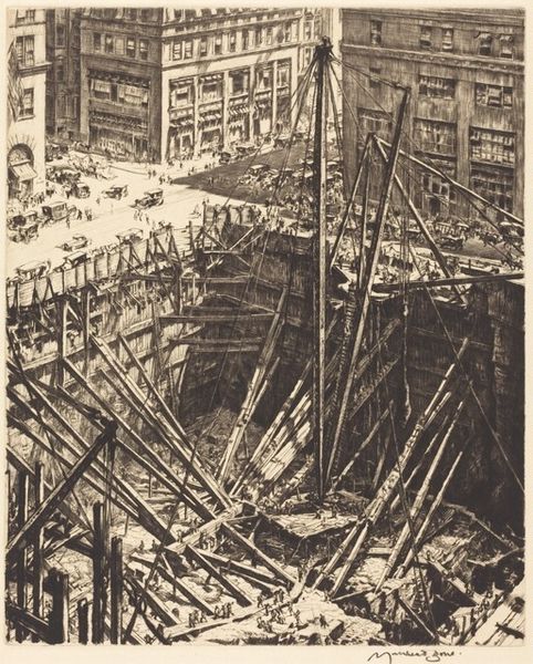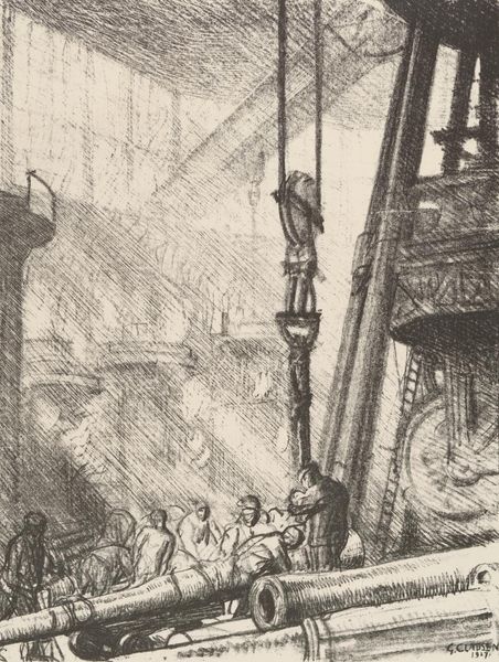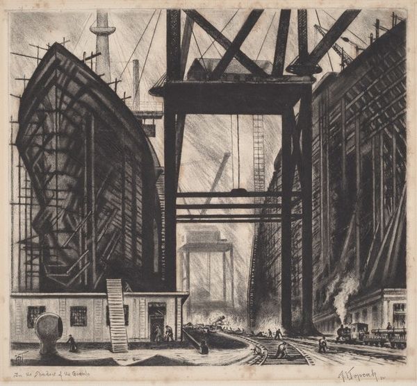 Carl Albert Walters made this drawing, Laying up the Ribs, in 1918. Walters' print hints at the enormous social changes brought about by the First World War. It shows the interior of a ship under construction, with men clambering around the ribs that form the vessel's skeleton. We can see a busy skyline in the distance. The subject matter reflects the war effort in the U.S., which involved rapidly building ships to transport troops and supplies to Europe. It reflects the glorification of labor during this time. In terms of institutions, we see a shift in art away from the pre-war focus on leisure and beauty and towards the celebration of manufacturing and industry. Does the artist critique the nature of this labor? Is it mere propaganda? By researching sources from the period, such as newspapers, magazines, and government documents, we can better understand the social and institutional context in which this image was created.
