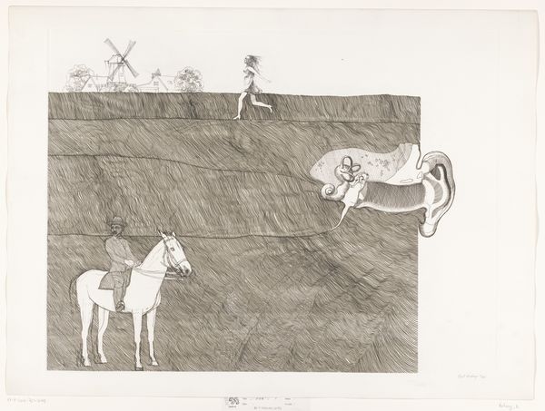 Aat Verhoog made this etching, Niet met de honden spelen, sometime in the 20th century. I love the artist's approach to mark-making; the whole image is built up with such careful, delicate strokes, creating a world that feels both real and dreamlike. The texture of the grass is amazing, it’s a dense field of tiny lines, almost like a woven fabric. It gives the image a tactile quality, like you could reach out and feel the slight roughness of the paper. The figures, especially the man and the ghostly child within the rectangle, seem to be straining against something, their bodies tilted as if pushed by a strong wind. The lines around them are so fine, they could disappear at any moment. Verhoog's piece reminds me a bit of Philip Guston's later works, not in style, but in the way both artists embrace a kind of raw honesty and a willingness to play with form and meaning. It’s a reminder that art is always a conversation, an ongoing exchange of ideas across time.