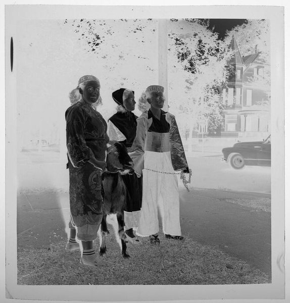 Curator: This is an untitled photograph by Jack Gould, held here at the Harvard Art Museums. It captures two women sitting on a curb. Editor: The atmosphere hits me first—there's this strange, quiet solitude. It feels like a forgotten memory, somehow both intimate and distant. Curator: Indeed. Note the composition. Gould frames the figures centrally, the house providing a rigid backdrop to their relaxed postures. The tonality is striking, a stark contrast emphasizing form. Editor: Those contrasts! Light becomes shadow and vice versa. It’s like looking at a world turned inside out, a dreamscape rooted in mundane reality. Curator: Semiotically, the curb becomes a stage. Their clothing hints at a narrative we can only begin to decipher. Editor: I love that! They're telling a story just by being there, existing in this inverted world. Curator: It’s a study in contrasts, literally and figuratively. Editor: Absolutely, a powerful quiet that lingers with you.