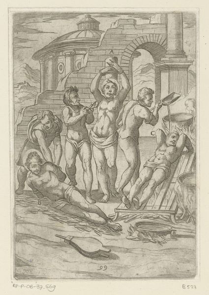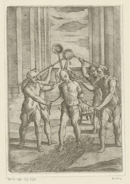 Antonio Tempesta created this etching, "Foltering: het afstropen van de huid," depicting skinning as torture. The image presents a scene of brutal punishment, common in early modern Europe, but also reflects the cultural and religious contexts of the 16th and 17th centuries. Produced in the Netherlands, this print resonates with the era’s religious conflicts and political unrest. The act of skinning, depicted with unsettling detail, takes place in front of classical architecture, and seems to be a pointed reference to institutional power and the brutal enforcement of social and religious norms. The fine lines and stark contrasts in the etching, typical of the period, enhance the dramatic tension and underscore the violence of the scene. As historians, our role is to examine such images within their historical milieus. By consulting period legal documents, religious texts, and social commentaries, we can better understand how these artworks reflect and shape the attitudes of their time. This etching challenges us to consider the social conditions that allow such violence to be not only practiced but also depicted and disseminated.