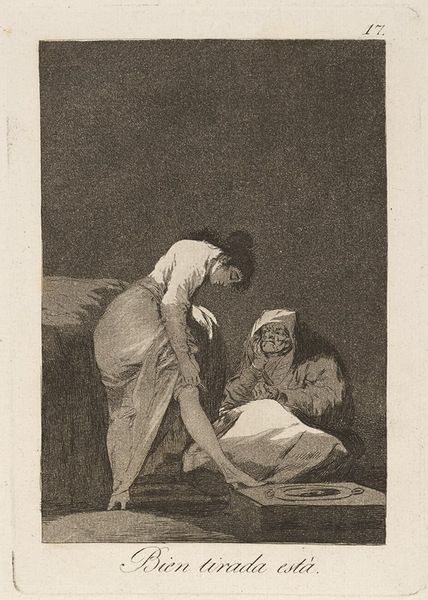 This is Pobrecitas!, one of Francisco Goya's etchings, which employs stark contrasts and aquatint to achieve dramatic tonal effects. The composition is built around a cluster of figures set against a looming, undefined background. Goya's technical approach here is masterful. The aquatint gives a granular texture, heightening the emotional intensity. We see the stark juxtaposition of light and shadow that draws our attention to the figures’ expressions and gestures. The artist's manipulation of light is not just descriptive; it is a powerful tool for conveying psychological depth. The heavy shadows can be interpreted through the lens of existentialism, reflecting themes of despair and the human condition. Are the expressive lines and tonal range used by Goya to challenge fixed meanings, engaging with new ways of thinking about power and representation? The interplay of light and shadow, is not merely aesthetic; it's a profound commentary on the struggles inherent in the human experience. Goya’s legacy resides in his relentless questioning and re-interpretation of humanity.