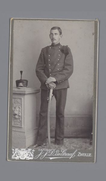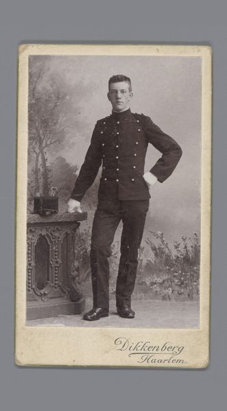 Axel Rydin created this portrait of a standing man in uniform with a cap. The figure dominates the frame, his uniform rendered in meticulous detail that conveys a sense of formality and order. Rydin uses the structural elements of military attire – the precise lines of the jacket, the symmetry of the buttons, and the rigid collar – to suggest themes of control and discipline. The monochrome palette further emphasizes the stark, unyielding nature of the subject's role. The artist’s formal choices seem to echo a broader cultural fascination with hierarchy and social structure. Yet, the sitter's gaze holds a hint of vulnerability, a subtle challenge to the otherwise impenetrable façade. This tension invites us to reconsider fixed notions of identity and the constraints imposed by societal expectations.