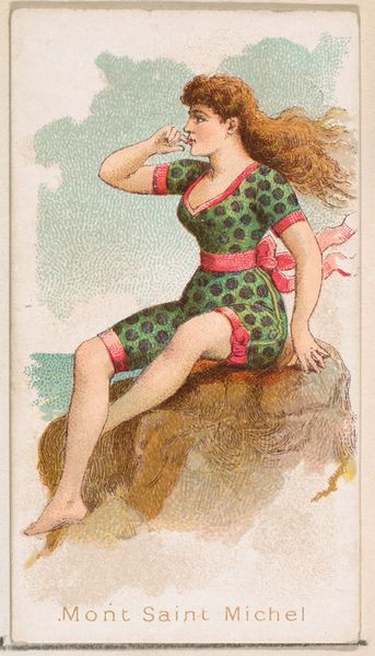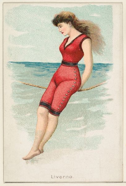 This is a chromolithograph, “Saint Malo,” from the Fancy Bathers series, printed by Wm. S. Kimball & Co. The composition invites the viewer into a study of contrasts through line and color: the vertical stripes of the bathing suit against the horizontal lines of the ledge; the cool blues and greens offset by the warm tones of the figure’s skin and hair. The figure, posed as if caught in a moment of contemplation, offers a study in controlled tension. The artist’s technique is subtle, yet strategic. The soft rendering of the background contrasts with the sharper detail of the figure, creating a focal point that draws the eye. This contrast serves not only an aesthetic purpose but also underscores the image’s thematic concerns with surface and depth, visibility and concealment. The work’s enduring appeal lies in its ability to invite ongoing interpretations, proving that the simplest forms can be rich in cultural and philosophical resonance.
