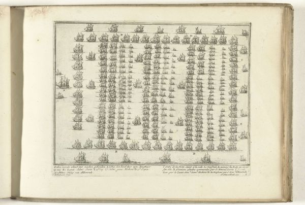 Curator: What a fascinatingly precise—yet unsettling—visual! All these rows and arcs, the identical ships, each emitting smoke... It’s almost mechanical, devoid of human emotion, despite depicting a battle. Editor: Indeed. Here, we’re observing “Slag bij Lepanto, 1571,” created by Frans Hogenberg between 1571 and 1573. It is an engraving that is part of the Rijksmuseum collection. And what we see displayed here is Hogenberg’s perspective on the naval Battle of Lepanto. The image’s meticulous composition reminds me of strategic diagrams from military history, the type crafted to rationalize complex geopolitical actions. Curator: Yes, there’s a real tension between its cartographic accuracy and the chaotic subject it depicts. The lines are crisp, definitive. I see meticulous arrangements, contrasting strongly with what would have surely been messy and devastating action on the water. How fascinating that line engraving can be chosen for its cool objectivity here! Editor: The choice of perspective is very interesting as well, isn’t it? Viewing from a detached bird’s-eye viewpoint gives an understanding of scale—hundreds of vessels arrayed—but diffuses all sense of actual battle. The ships of the Holy League, top, engage against the Ottoman fleet. Hogenberg’s image reinforces a particular narrative by visually dominating, the arrangement giving order to an event experienced perhaps as confusion. Curator: Agreed. Semiotically, each identical ship reads less as an individual vessel and more like a repeating motif—a symbol. Hogenberg seems intent to present order above chaos. It is tempting to see the lack of differentiating details across these vessels as evidence of authorial intention or commentary around both sides of this conflict in general. Editor: Precisely, and how these themes interplay. Scale, for instance: a single image designed to convey all this complex information. Consider the implications of turning something so immense and complicated into a consumable image during a time of heightened European tension. The visual’s legibility then becomes critical, serving a powerful role. Curator: So true. Now, looking once more with fresh eyes at Hogenberg’s design… Well, the way meaning is embedded into this is very thought-provoking. Editor: I couldn’t agree more. Considering the context, we see an impactful image which can bring so many historical ideas to bear, offering something of both propaganda and archival significance.