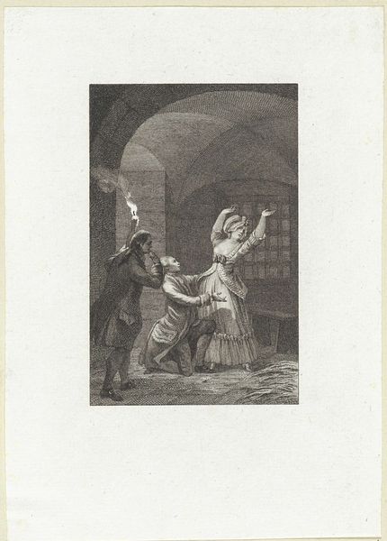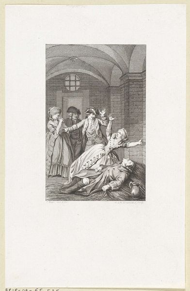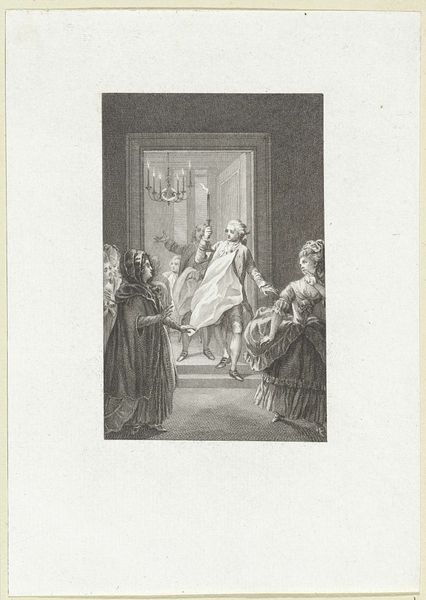 Reinier Vinkeles made this etching, “Couple Caught by a Woman,” using metal, acid, and ink. The sharp, precise lines we see are a direct result of the etching process. Vinkeles would have coated a metal plate with a waxy, acid-resistant substance, then scratched his design through this coating. When the plate was submerged in acid, the exposed lines would be eaten away, creating grooves. Ink was then applied to the plate, filling these grooves, and the surface was wiped clean. Finally, the image would be transferred to paper under high pressure. The resulting print has a unique graphic quality. Look closely at how Vinkeles used hatching and cross-hatching to create areas of light and shadow, giving depth and volume to the figures. This print wasn't just about illustrating a scene; it was also about showcasing the possibilities of the etching medium itself. Appreciating this print means understanding the labor involved in its making, and its place within a broader history of printmaking as both craft and art.