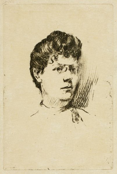 Editor: This is "Drypoint Number Five: Portrait" by Donald Shaw MacLaughlan, made in 1909. It looks like the main materials are metal and paper since it's a print. I am fascinated by the detail created with the drypoint technique; you can see individual lines that create a sense of texture. How does this use of material and technique speak to you? Curator: Well, consider the historical context: Printmaking in the early 20th century was increasingly accessible due to industrial advances, yet it retained a connection to older craft traditions. MacLaughlan's choice of drypoint, a demanding technique, reflects a deliberate engagement with labor and the physical process of image making. What does that scarcity mean today in terms of material consumption and artistic intention? Editor: So, it's a conscious decision against mass production. The artist is deliberately showing skill, not just churning out images easily. How would this portrait compare to others made at that time, for example in painting? Curator: Exactly. A painted portrait, even a modest one, still connoted wealth and patronage. A drypoint print like this, made to be reproduced but still carrying the mark of the artist's hand, potentially circulates amongst a different social class and can be a critical cultural assessment through accessibility. Does the medium change who and how he’s representing? Editor: That’s interesting! So the choice of materials and method is almost a political statement in a way. I had only thought of it as an artistic choice, but it seems tied to social and economic factors too. Curator: Precisely. By understanding the labor and material conditions of its production, we gain insight into the artwork's potential role in shaping and reflecting social values. I hope you realize materiality speaks beyond appearance! Editor: I do. Thanks so much! I’ll never look at prints the same way again.