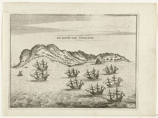 Curator: Let's take a closer look at this engraving from 1685 to 1687; it's titled "De Hollandse vloot onder Michiel de Ruyter voor de stad Algiers, 1662", by Bastiaen Stopendael, part of the Rijksmuseum collection. Editor: My first thought is what a striking composition! The crisp lines delineate form; notice how the ships fill the foreground while Algiers itself seems nestled against the hills beyond. Curator: Absolutely, Stopendael masterfully uses that contrast. The piece depicts the Dutch fleet under Michiel de Ruyter positioned off the coast of Algiers in 1662. It illustrates a significant moment of Dutch naval power projection in the Mediterranean, intended to protect their trade interests and suppress piracy. Editor: Semiotically, the ships act as signs, of power and wealth, the artist highlights this contrast using crisp lines against a less distinct city, no? They appear robust and heavily armed, a testament to the importance of naval technology and strategy during the Baroque period. I am especially captivated by the light play throughout the composition. Curator: Precisely. The light, in my interpretation, can be seen as emphasizing the moral high ground claimed by the Dutch Republic, illuminating their righteous mission. The event itself underscores the complex relationship between Europe and North Africa, a blend of trade, diplomacy, and, at times, military intervention. The Dutch certainly viewed this intervention as critical to their economic interests, using this imagery to further state power back in the republic. Editor: It is compelling how he conveys this. Thinking about the scale, in relation, really drives home the symbolic heft the scene bears! I appreciate how this artwork allows for discussions about art's role as historical record and political imagery. Curator: Indeed. It highlights the Dutch Republic's strategic ambitions and its interactions with other cultures in that historical moment. Editor: And I, in turn, value Stopendael’s print for its formal qualities, which provide visual language to explore those ambitions!