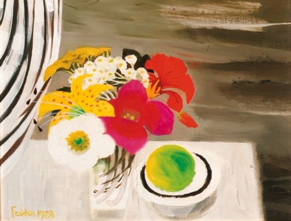 Editor: This is Mary Fedden's "The White Hyacinth," painted in 1984 using oil paints. The still life, set against an odd landscape, strikes me as a curious combination. What formal qualities stand out to you in this composition? Curator: Note how the geometric rigidity of the drawer-table establishes a clear foreground. Then, observe how Fedden uses the alternating dark and light bands of the tabletop to mediate the distance between the foreground still life and the backdrop, composed of loosely geometric landscape elements. The white hyacinth and plate almost create visual rhymes. Editor: So you see a conversation primarily between shapes and their placement, not necessarily symbolism? Curator: Precisely. Consider how Fedden’s palette utilizes a restrained range of hues. Note the flat application of paint that emphasizes form and minimizes depth, collapsing the landscape into a near-planar composition. The eye is not guided into the depth of field, but across the surface of the work. Are you drawn to the subtle variation in the application of white? Editor: I hadn’t thought of it that way. It’s as though the different shades and textures create a sense of contained chaos, playing off of one another. Curator: Indeed. By denying conventional perspective and emphasizing flatness, Fedden prompts us to contemplate the picture as an object rather than a window. This allows us to focus on the relationship between forms, colors, and textures within the pictorial space itself. Editor: It’s fascinating to reconsider this as less of a representation and more of an arrangement of pure visual elements. Thanks for pointing that out. Curator: It has been a pleasure to analyze this piece together and observe these relationships between line, color and form, and to discover an aesthetic unity beyond subject.