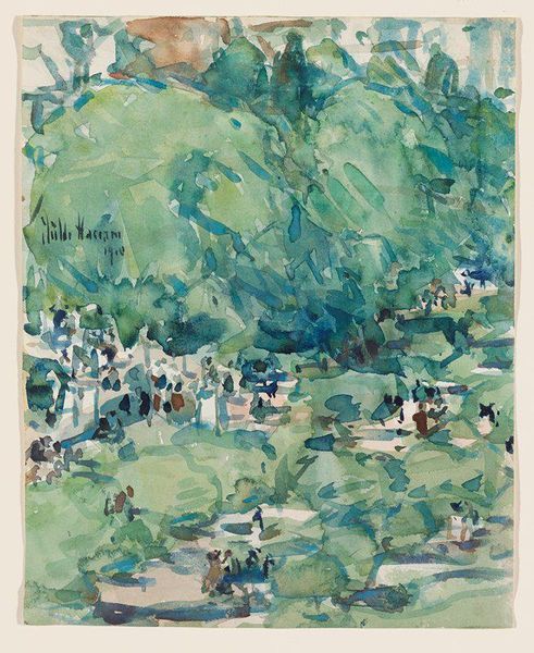 Editor: We're looking at "Figures in a Landscape" by Mark Rothko. It seems to be either a drawing or a watercolor, possibly done *en plein air.* I’m struck by the juxtaposition of the loosely rendered figures with the more structured architectural elements, and the overall slightly melancholic mood it evokes. What do you see in this piece? Curator: Primarily, I see a fascinating study in composition and form. Notice how Rothko employs a limited palette, yet manages to define space through contrasting blocks of color. Observe the tension between the verticality of the trees and the horizontality of the benches, a play which echoes in the figures. Is this relationship complementary, conflicting, or merely coexisting? Editor: I hadn't considered that interplay. The buildings in the background seem very flat compared to the figures, which adds to the somewhat disconcerting feeling of depth or lack thereof. How do you feel about his style choices, specifically what appears to be a blend of realism and abstraction? Curator: The painting embodies both realist elements—observable in the depicted landscape and figuration—and a tendency towards abstraction. Rothko skillfully deconstructs the visual world into its essential components, using form and color to elicit emotional responses. What do you make of Rothko’s simplification of the human form and its impact on the painting’s overall meaning? Editor: I think the lack of detail on the figures creates a sense of universality, almost as if they’re placeholders for anyone and everyone. Curator: An astute observation. Through visual analysis we can infer that his intent was not necessarily representational, but emotive. It allows viewers to find their own entry point. This exploration of color and shape opens to complex perspectives. Editor: Thanks for pointing out those relationships; now I can see so many tensions I hadn't noticed before! Curator: Indeed. It showcases the power of analyzing inherent structures.