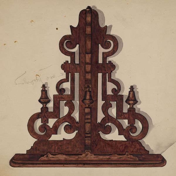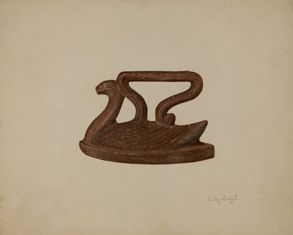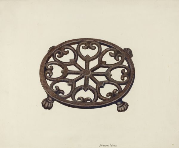 Curator: Here we have John Price's watercolor drawing "Foot Scraper," created around 1942. What are your first thoughts? Editor: Well, there's a striking stillness about it. The object itself is quite humble, yet the ornate design elements introduce a level of sophistication, a delicate curve mirrored by another. The palette reinforces that tension. Curator: Indeed. The artwork itself, made using watercolors, provides a sharp contrast with the very nature of the item depicted: a metal foot scraper. John Price was one of many artists employed through the WPA’s Federal Art Project. Editor: So, a pragmatic object immortalized through the lens of governmental support during a crucial period? The very idea seems to suggest art's democratic function in wartime. Focusing in, there is also much intricacy with how Price rendered this piece. It seems he truly studied the subject. Note the rust on the metal; it’s palpable. Curator: Exactly! These artists often focused on elements of everyday life, imbuing them with a sense of importance and cultural value. There’s an argument to be made that this emphasis aimed to build morale and reinforce a sense of shared American identity during times of hardship. Editor: One has to marvel at the academic realism on display, the play of shadow that gives this seemingly banal item heft and purpose. It could be the centerpiece of a still life by Chardin. The attention to detail invites closer inspection and meditation on the beauty of functionality. It speaks to how everyday objects can inspire profound creative response. Curator: Absolutely. It is also worth considering how its function changed from being outside someone's doorstep into the inside of a gallery as an exhibited piece of art. Editor: It truly asks us to find beauty in unexpected places, and I appreciate the simplicity and elegance, the subdued colors almost forcing the viewer to truly *see* the piece. Curator: And through the artistic process, everyday objects can gain value that surpasses their mere utilitarian function. Editor: A fine lesson in noticing and appreciating, I think, whatever its historical intentions might have been.