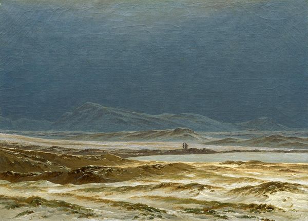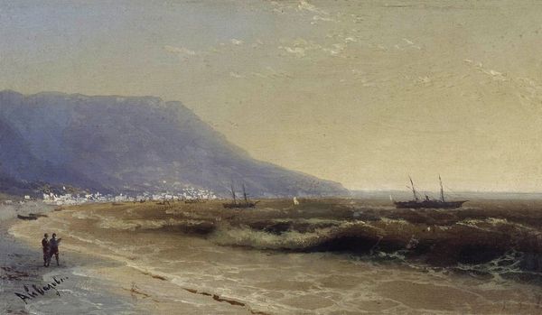 Gustave Courbet made this oil painting, "Seascape Near Trouville," sometime in the mid-19th century. At first glance, the painting is dominated by broad, horizontal bands of colour: the tan of the beach, a grey-blue sea, and the misty expanse of the sky. These bands are punctuated by dark, rugged rocks in the foreground and soft, grey clouds above, creating a sense of depth and atmosphere. Courbet's realist approach is evident in his attention to the materiality of the paint itself. Thick, visible brushstrokes define the clouds and rocks, emphasizing texture and the physical presence of the scene. This focus on materiality and form aligns with Courbet's rejection of idealized academic painting. Rather than presenting a romanticized view, Courbet captures the stark reality of the natural world. The subdued palette and the rough texture of the paint contribute to an emotional tone that is less about beauty and more about the immediate, sensory experience of being at the beach. The painting challenges our expectations and provides a direct encounter with nature.