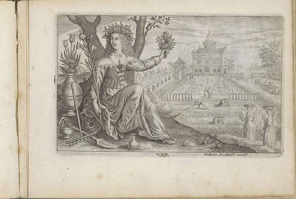 Curator: This is "The Elders Trying to Seduce Susanna," an engraving by Hans Collaert the Elder. I'm drawn to the symbolism here, the contrast between purity and lechery, played out in a garden, no less. Editor: The garden is interesting. I'm struck by the material reality of the print itself. Look at the lines, the way the engraver has rendered the textures of fabric and flesh. Curator: It's a classic morality tale, isn't it? Susanna represents innocence, unjustly accused. The Elders are the embodiment of corrupt power, abusing their position. Editor: Yet Collaert's technique, the labor involved, elevates it beyond mere moralizing. Notice the detail in the fountain, it's almost a catalog of material culture. Curator: And those details reinforce the broader themes. The garden, the fountain, are symbols of abundance and temptation. Susanna's virtue shines against that backdrop. Editor: I see it, but the very act of engraving, the multiplication of this image, speaks to a broader social commentary on power, consumption, and dissemination of these narratives. Curator: Well, seeing the symbols and archetypes really brings the story to life for me. Editor: For me, it's the tangible evidence of labor and social context that allows the story to resonate.