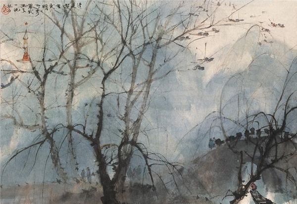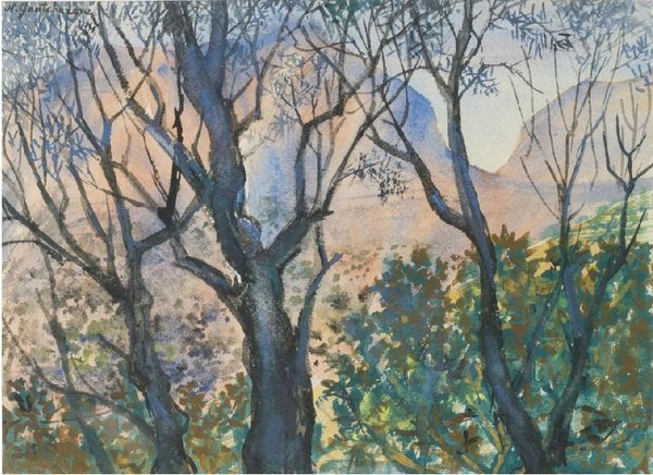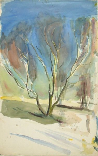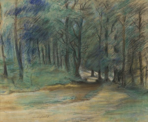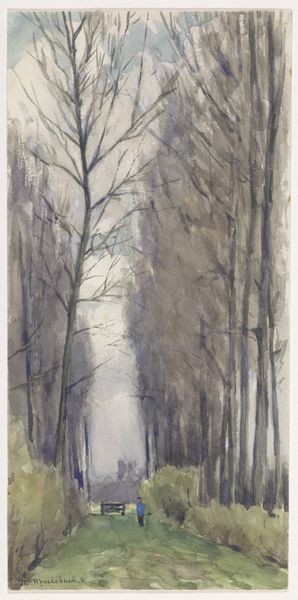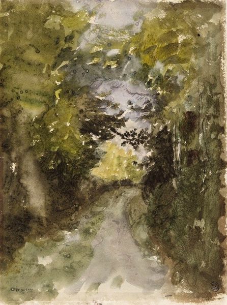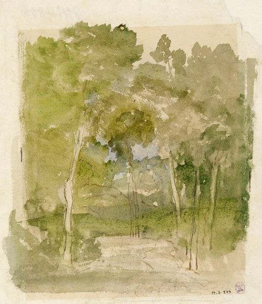 Editor: This is "In Rokeby Park," a watercolor and plein-air work by John Sell Cotman, dating back to somewhere between 1800 and 1810. It strikes me as quite atmospheric, almost dreamlike with its muted blues and greys. What do you see in this piece, considering the time it was made? Curator: It's a fascinating window into the burgeoning Romantic sensibility of the early 19th century. Consider Rokeby Park itself - a site celebrated in literature, particularly Walter Scott's poem *Rokeby*, published in 1813. Cotman’s choice of such a locale highlights the increasing importance of place in artistic and cultural identity. How do you think this ties into the rising interest in landscape painting at the time? Editor: Well, I suppose the connection to a literary landmark would enhance its appeal. Were people deliberately seeking out these romantic, picturesque scenes in real life, then commissioning or buying artworks that depicted them? Curator: Precisely! And the watercolor medium here isn’t accidental. It offered a sense of immediacy and direct engagement with the landscape, further democratizing access to fine art. Do you think that the monochrome palette limits its potential? Editor: Initially, I thought it did. But now, seeing it as a deliberate choice, it perhaps reinforces that sense of melancholy and reflection that was so valued during the Romantic era, giving the park a weight beyond just topography. Curator: I agree. It invites us to consider not just *what* is depicted, but *how* the depiction itself speaks to the broader cultural moment. Think about the rise of landscape art's commercial viability and how that fuelled a demand. That context explains a lot about why Cotman made *this* painting, at *this* place, at *this* time. Editor: I never thought about art in terms of the demand! Seeing it through the lens of its public role and historical forces, makes it even richer. Curator: And there's always more to explore. The conversation on art and societal dynamics continues, which is really quite powerful.